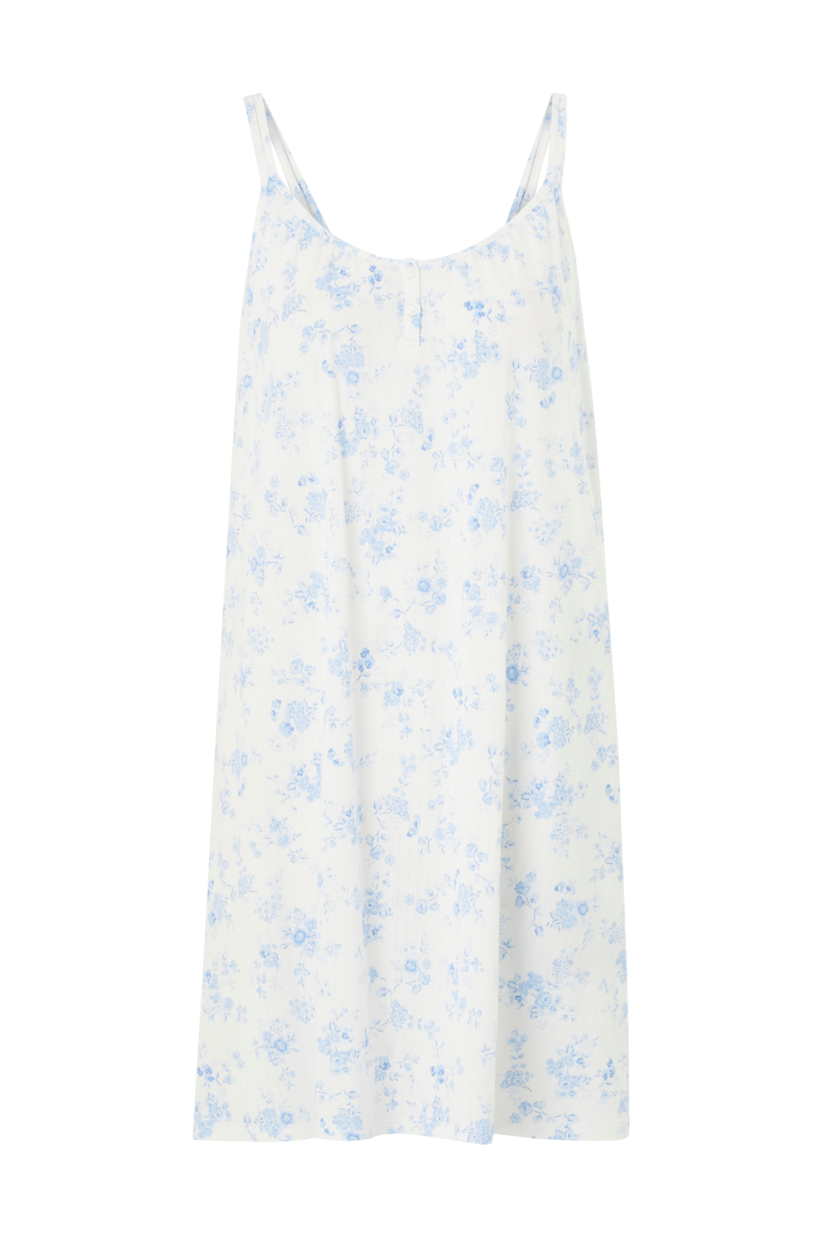 • Ærmeløs model med svaj• Rund hals med kort knaplukning foran