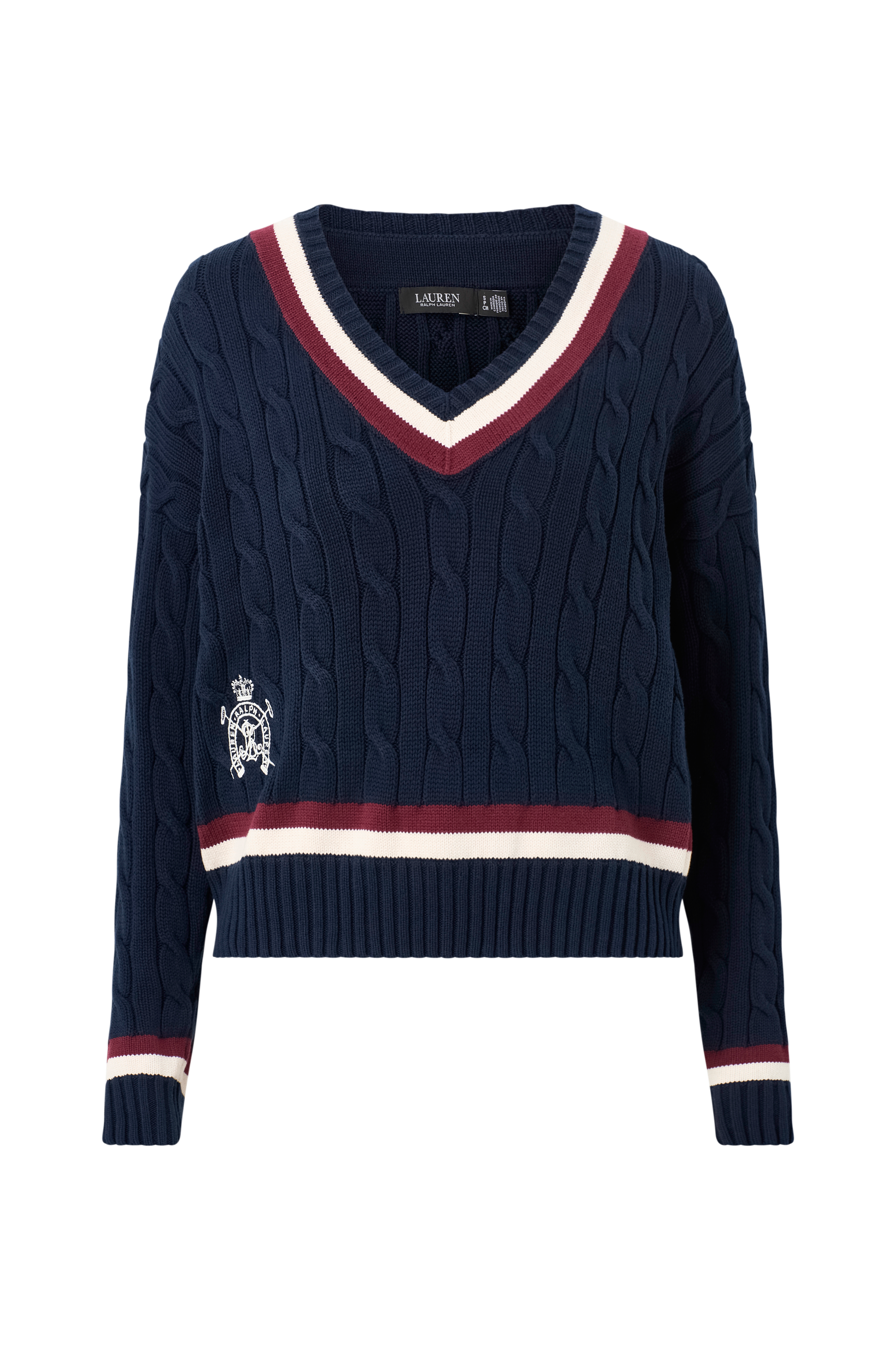 • Langærmet, kabelstrikket Pullover i bomuld• V-formet, ribstrikket halsudskæring• Broderet logo på den ene side• Ribstrik ved manchetterne og ved nederste kant