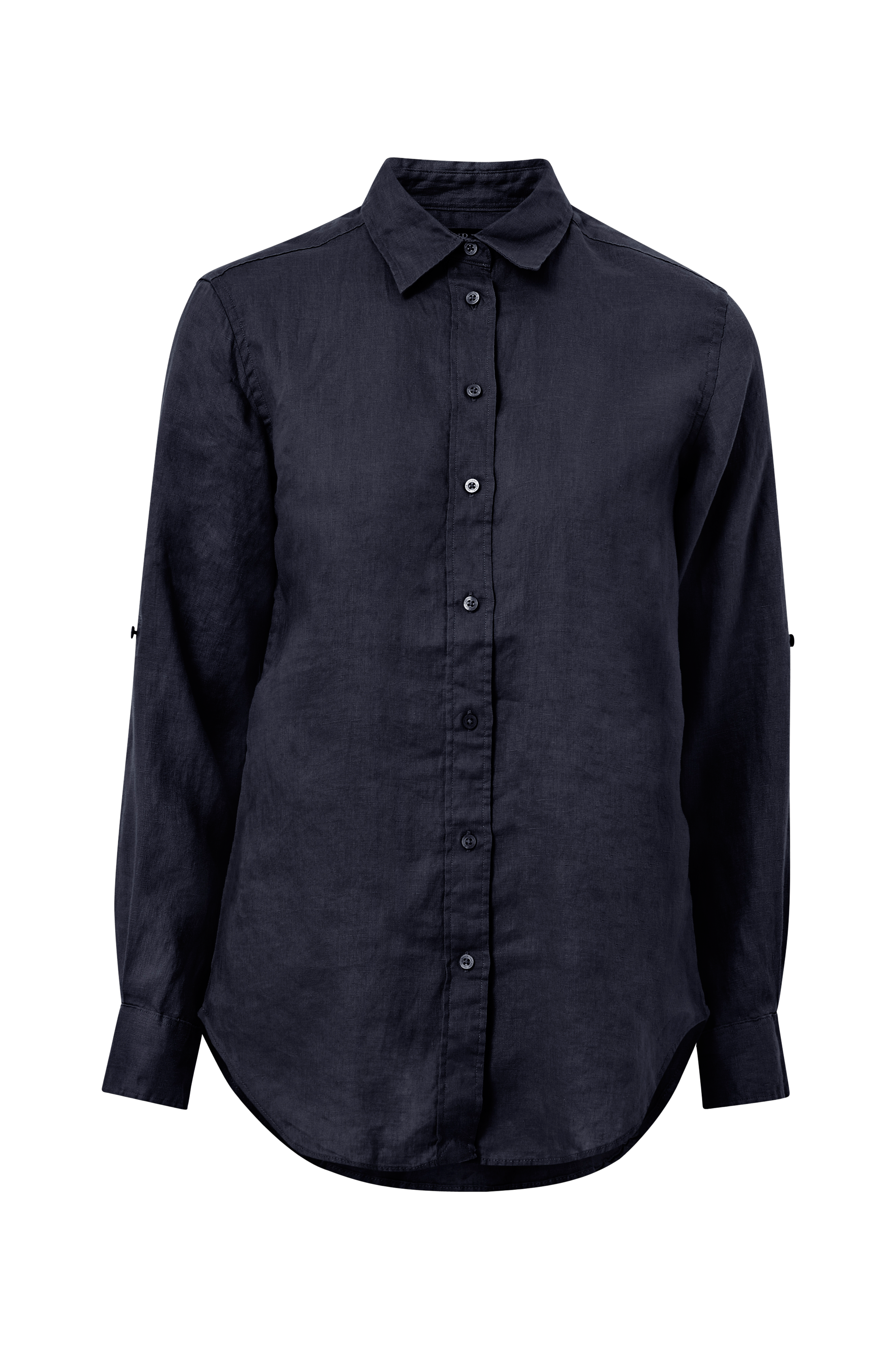 Skjorte i hørkvalitet med lille krave og pyntestukket stolpelukning foran. Langt ærme med manchet i ærmekanten og indvendig knaptamp til opsmøgede ærmer.