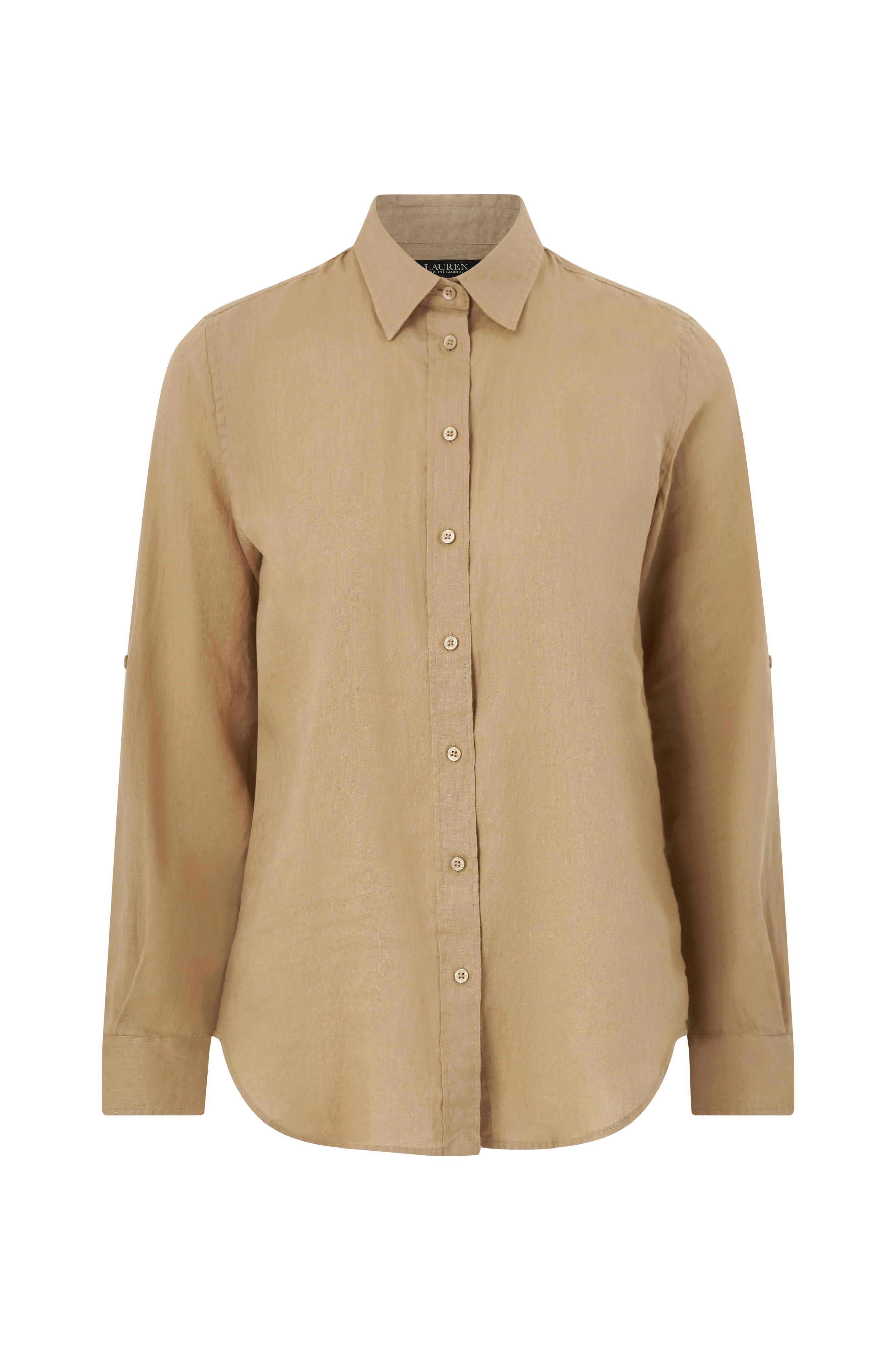 Skjorte i hørkvalitet med lille krave og pyntestukket stolpelukning foran. Langt ærme med manchet i ærmekanten og indvendig knaptamp til opsmøgede ærmer.