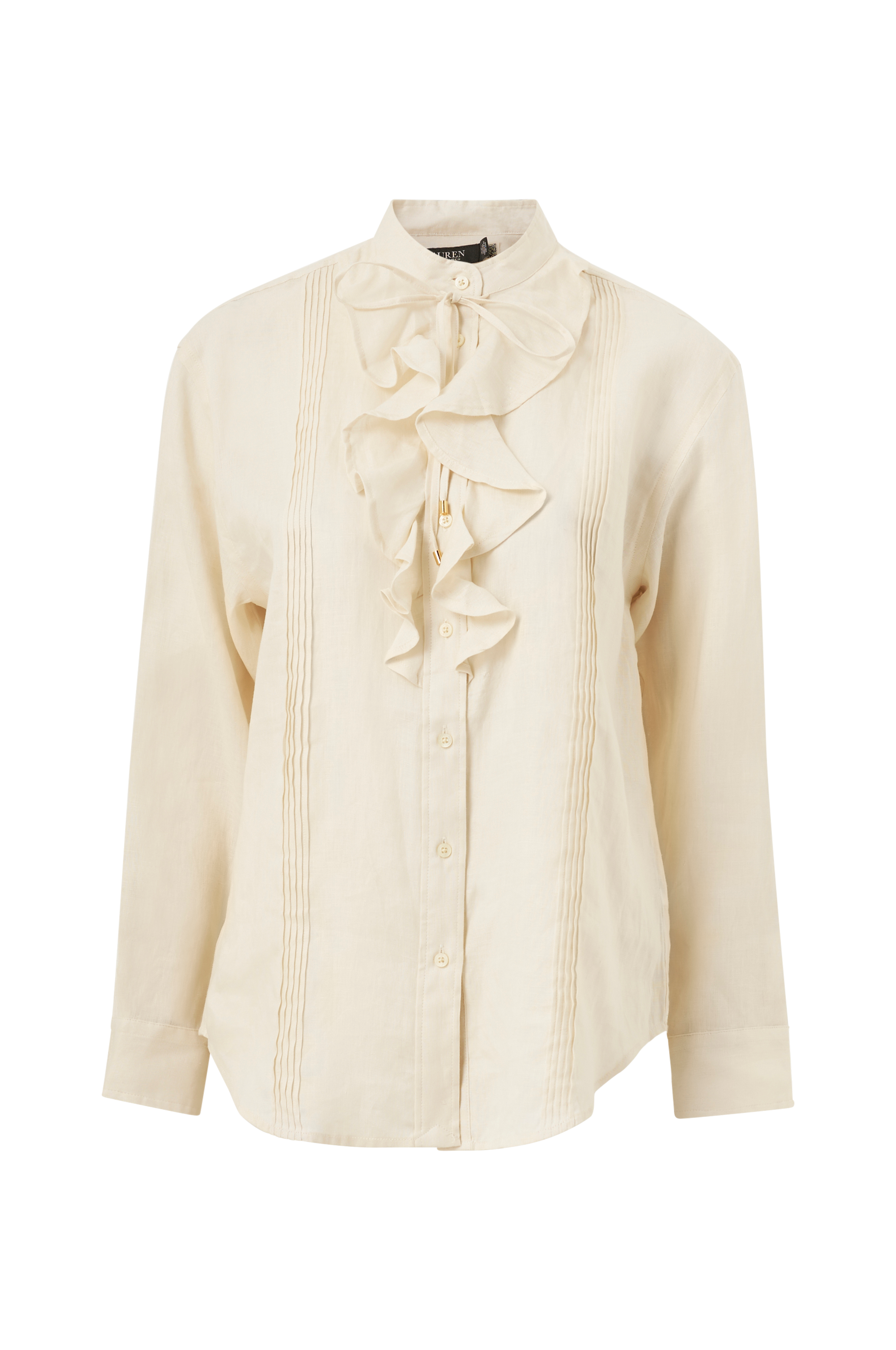 Skjorte i hør med biser og flæser foran. Rund krave med bindebånd. Knapper. Manchet med en knap.
