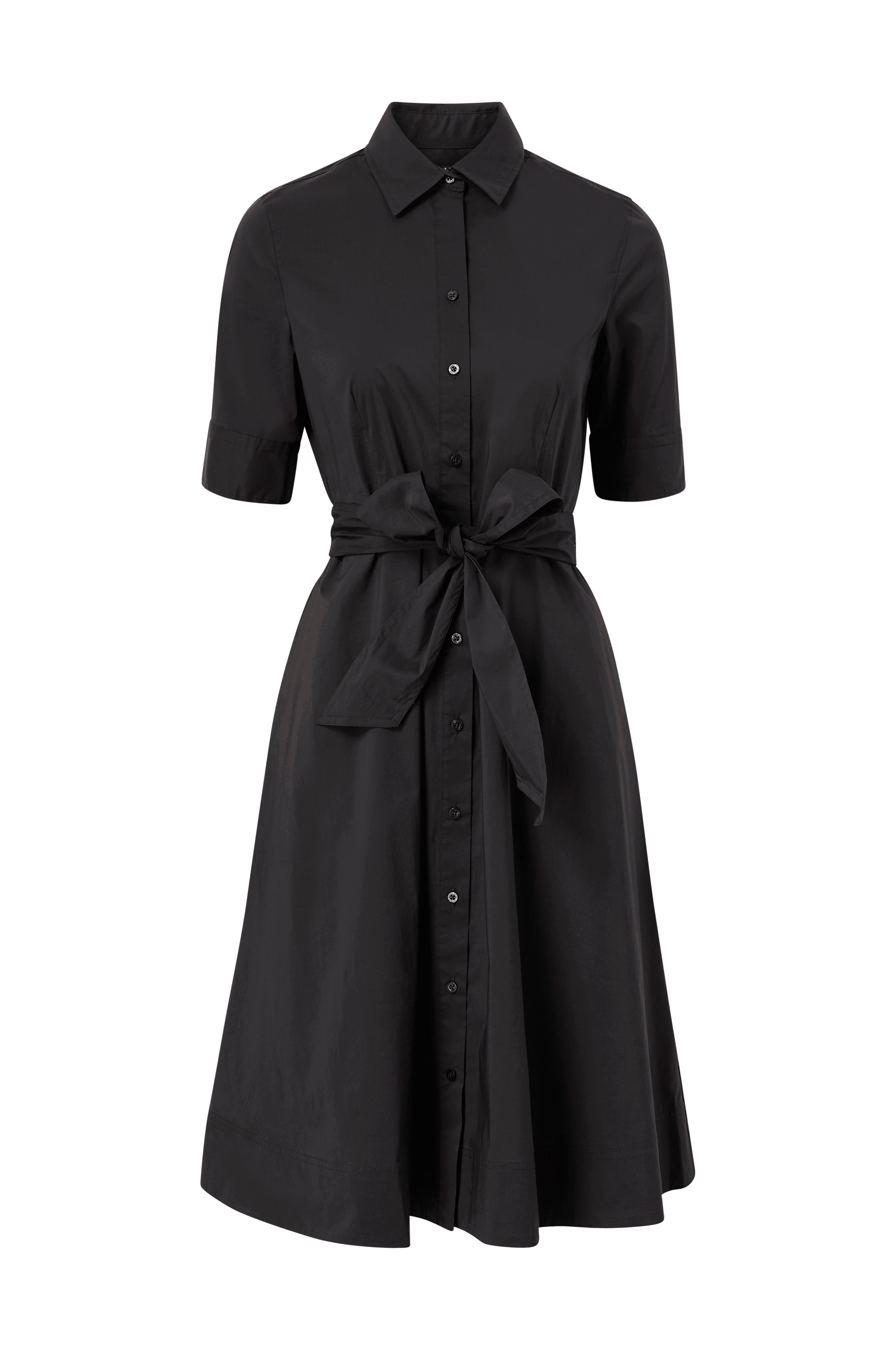 Figursyet model med afskæring og bindebælte i taljen og vidde i nederdelen med indsatte lommer i siderne. Lille krave og lukning hele vejen foran samt kort ærme med bred manchet i ærmekant. Længde ca. 108 cm i str. 36.