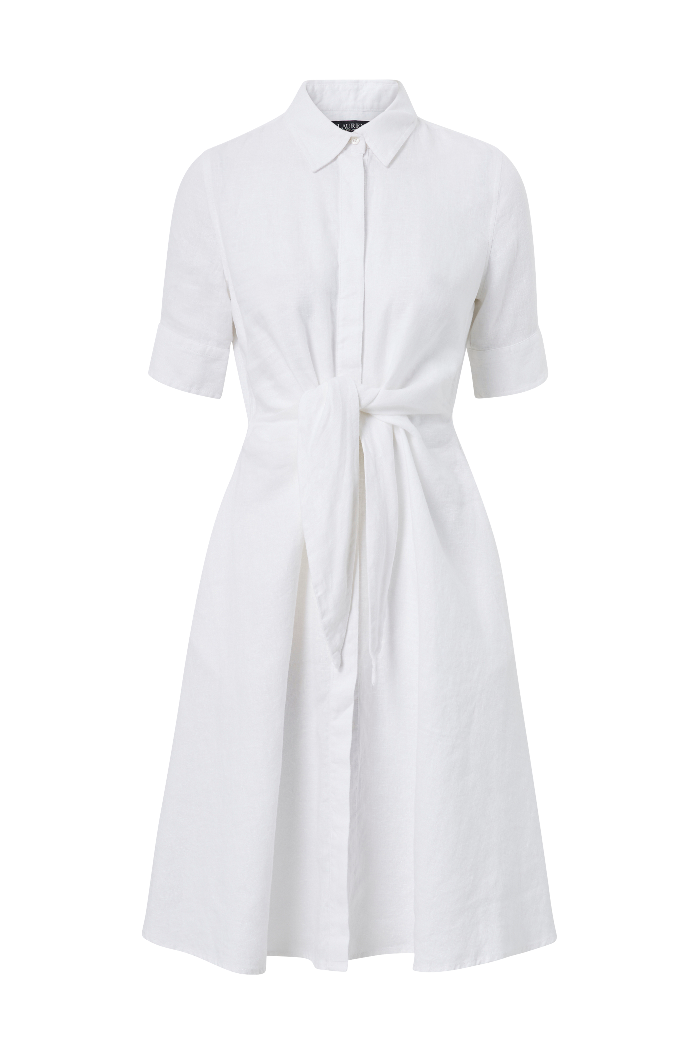 Figursyet model i vævet hør med lille krave og lukning med betrukne knapper hele vejen foran. Kort ærme med bred manchet i ærmekant samt afskæring i taljen med indsat bindebånd foran. Indsatte lommer i siderne. Længde ca. 107 cm i str. 36.