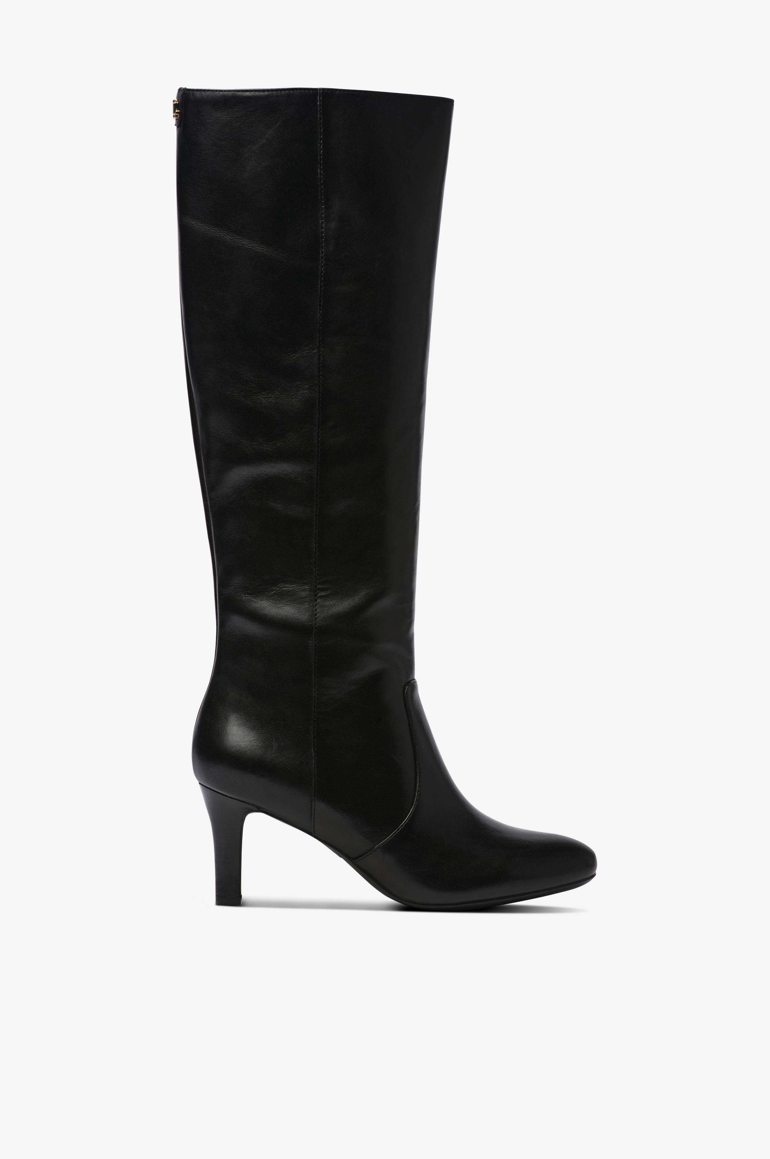 • Model i læder• Afrundet, spids snude• Tynd hæl• Lynlås på indersiden med elastisk panel øverst• Tekstilforing• Skafthøjde: 40 cm i str. 37• Skaftvidde: 39 cm i størrelse 37• Hælhøjde: 7 cm