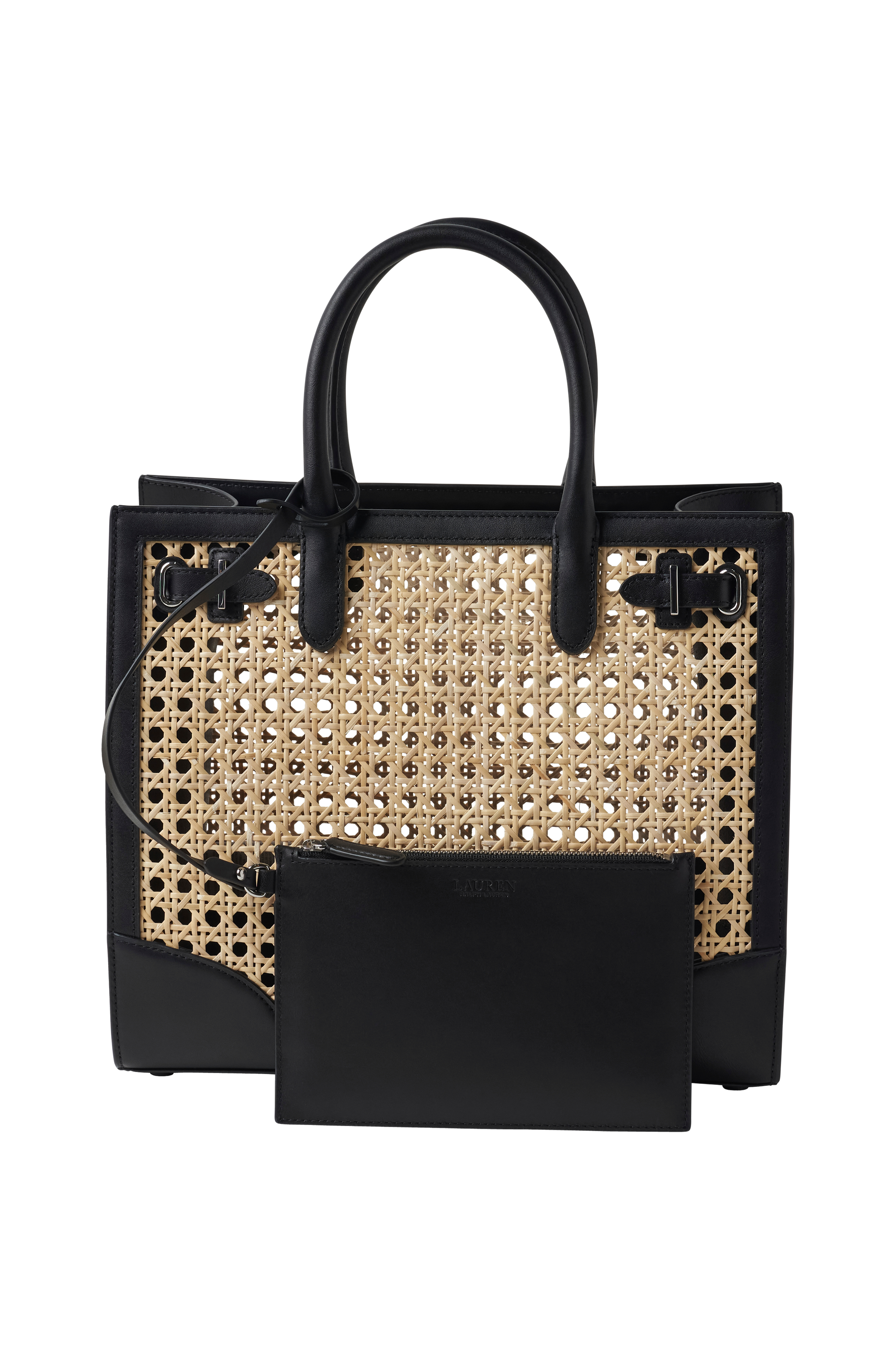 • Taske i Rattan og læder• To bærehåndtag• Aftagelig pung med lynlås medfølger•