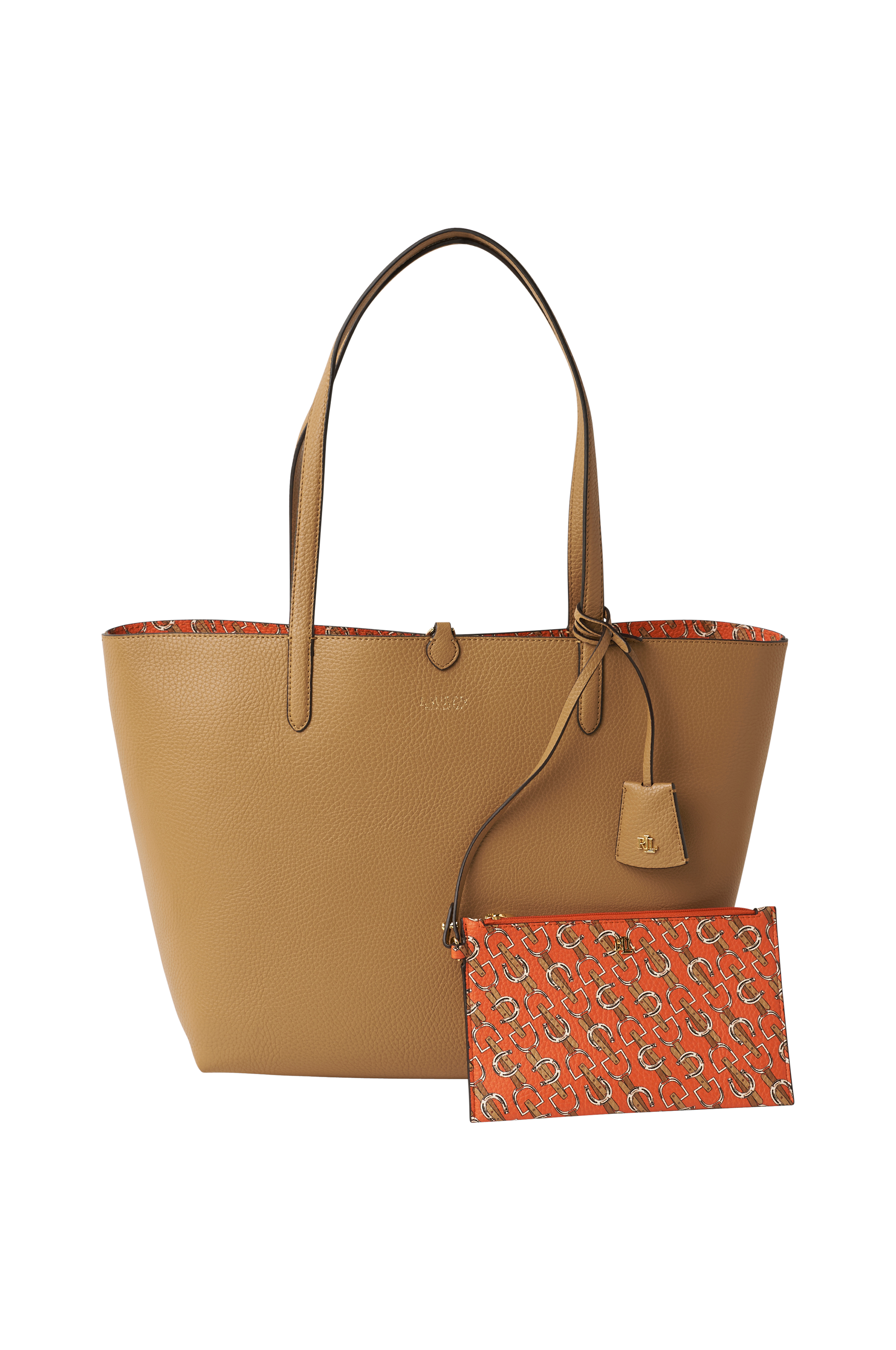 Taske af imiteret skind. Lukning med karabinhage i metal. To bærehanke. På det ene bærehåndtag sidder en nøglering med etui. En mindre makeuptaske med lynlås medfølger. Tasken er vendbar, den anden side er i kontrastfarve.