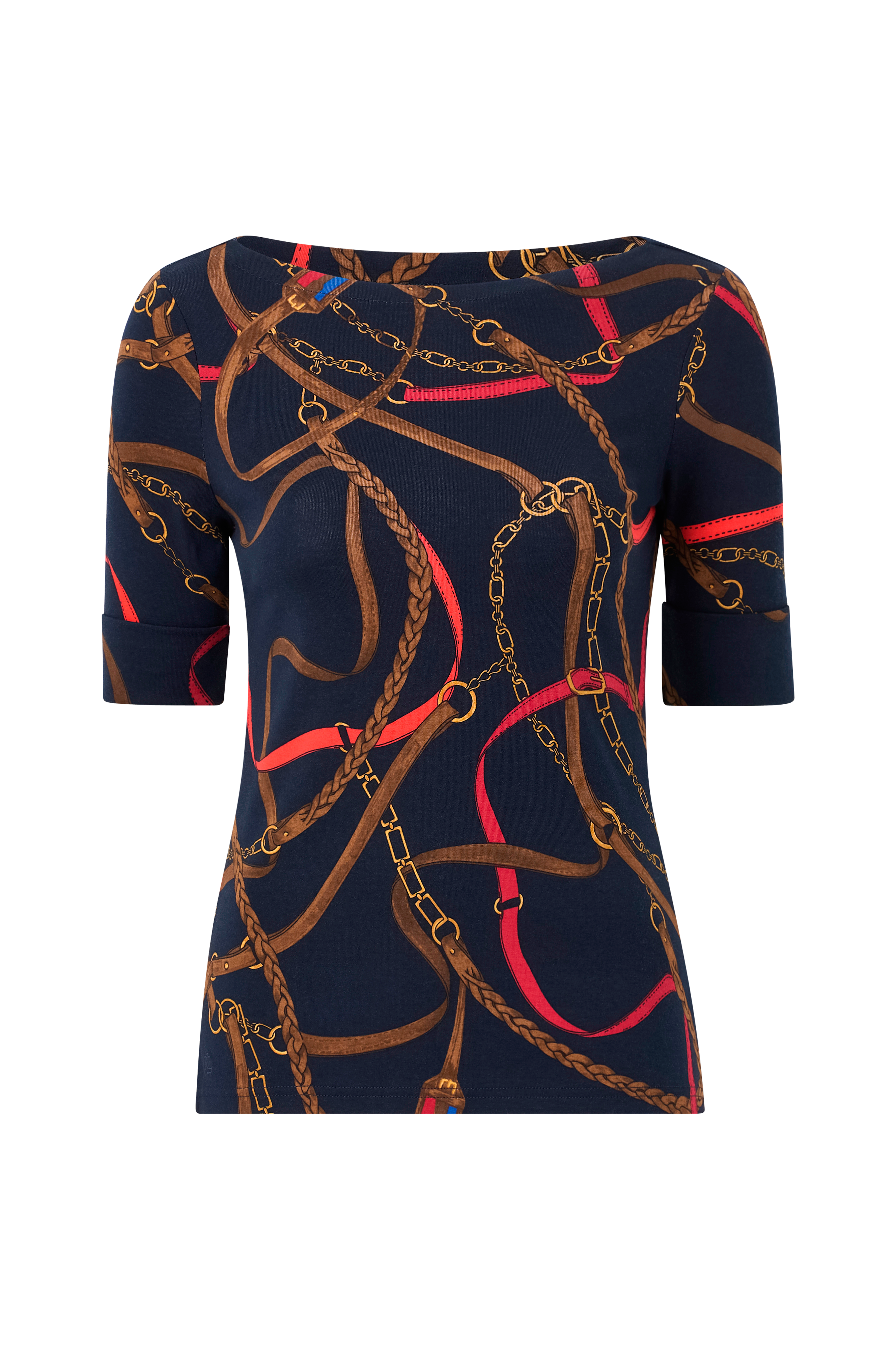 • Elastisk, figursyet top med Bådhals• Korte ærmer med syede ærmeafslutninger• Slids nede i siderne