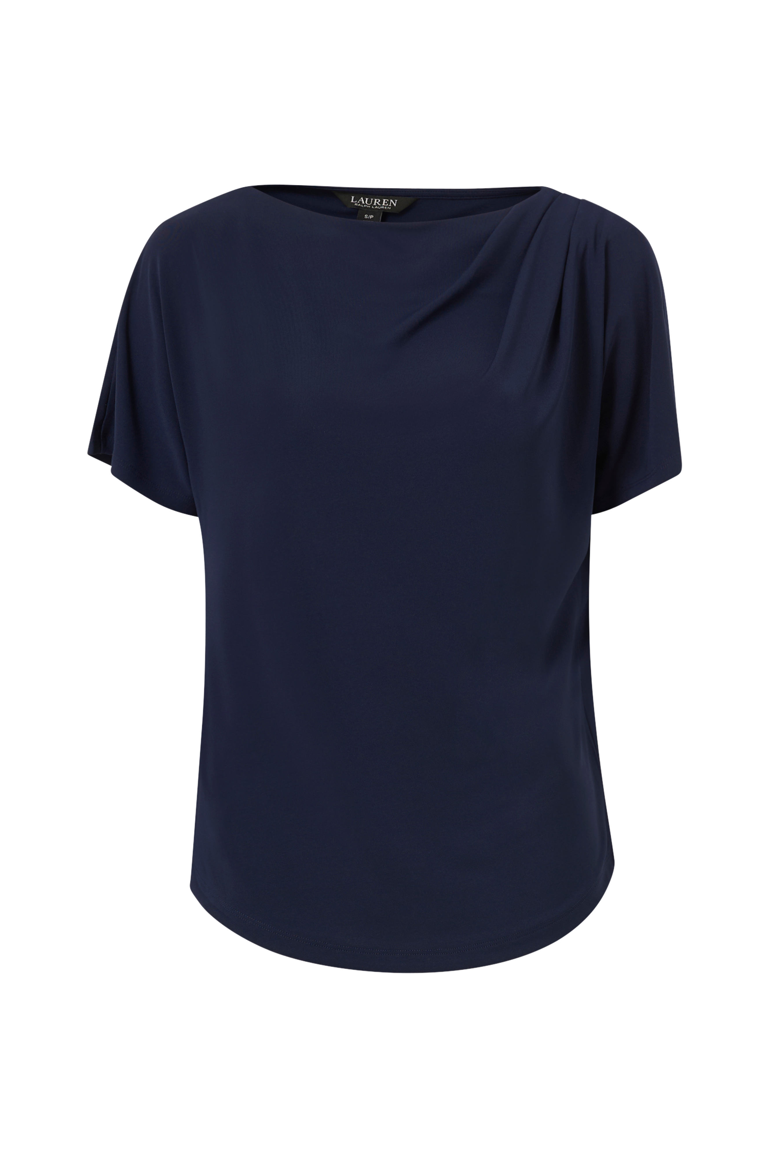 • Top i jersey• Bådudskæring• Flæset drapering på en skulder• Korte ærmer
