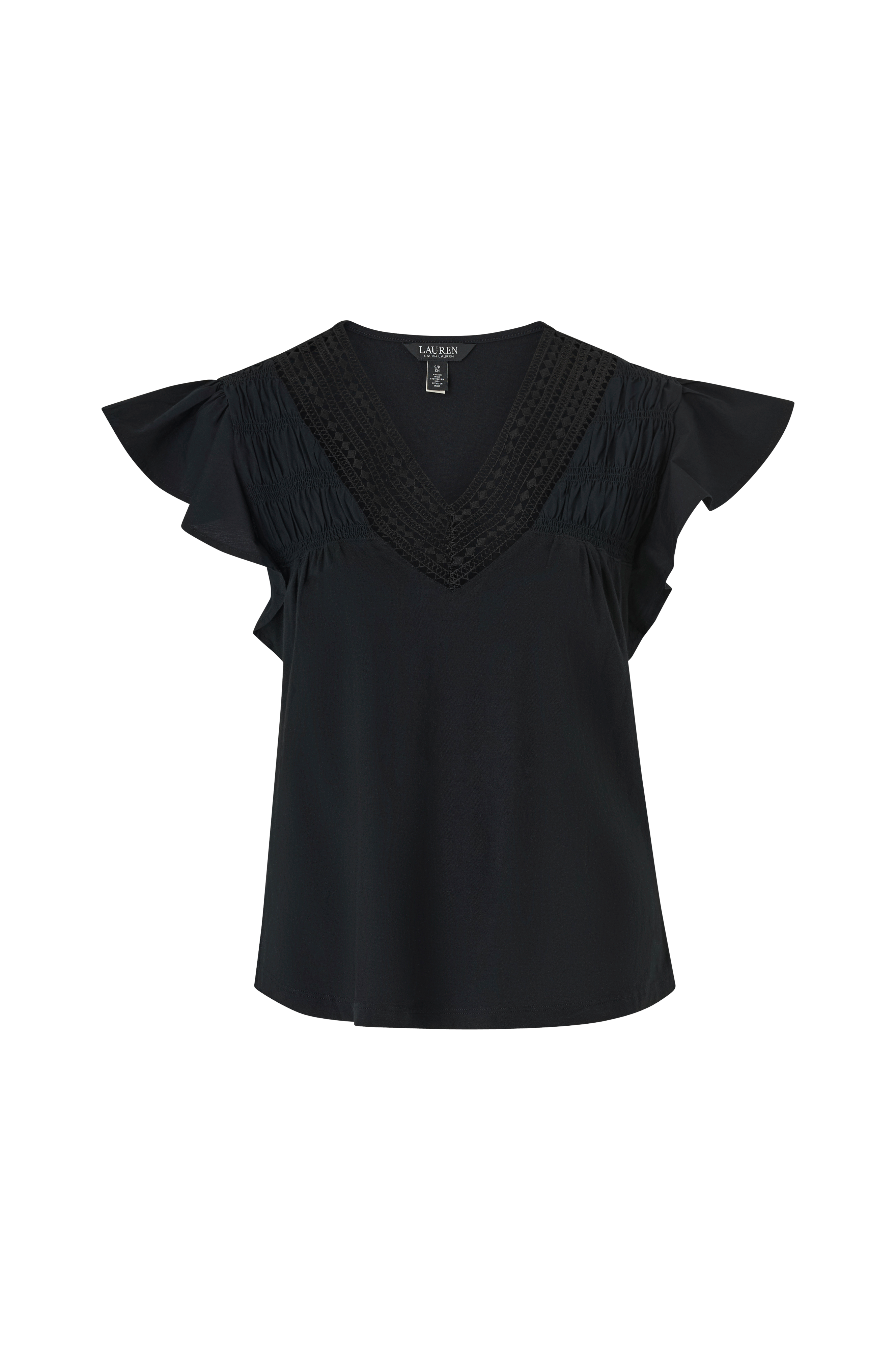 • Model i jersey• V-formet halsudskæring med blondeindlæg• Vævet linning foran med elastiksømme• Vævet volant omkring ærmegabene• Afrundet søm