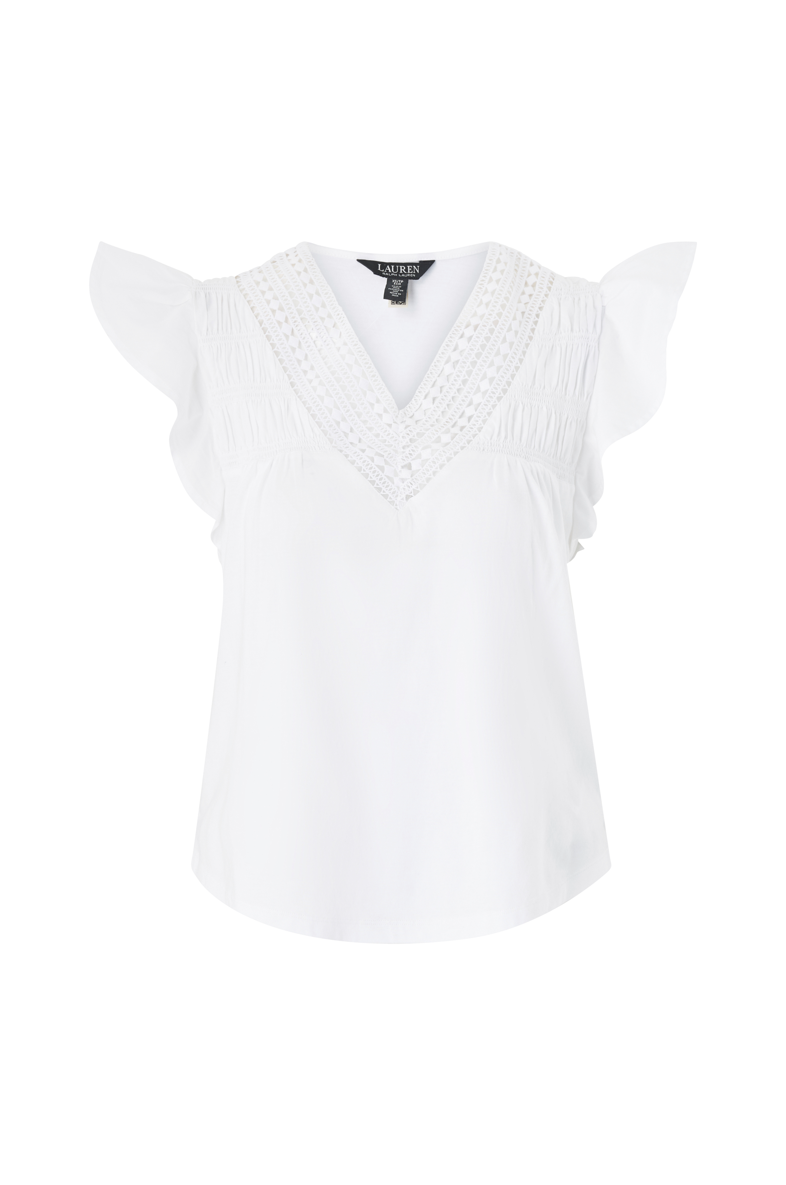 • Model i jersey• V-formet halsudskæring med blondeindlæg• Vævet linning foran med elastiksømme• Vævet volant omkring ærmegabene• Afrundet søm