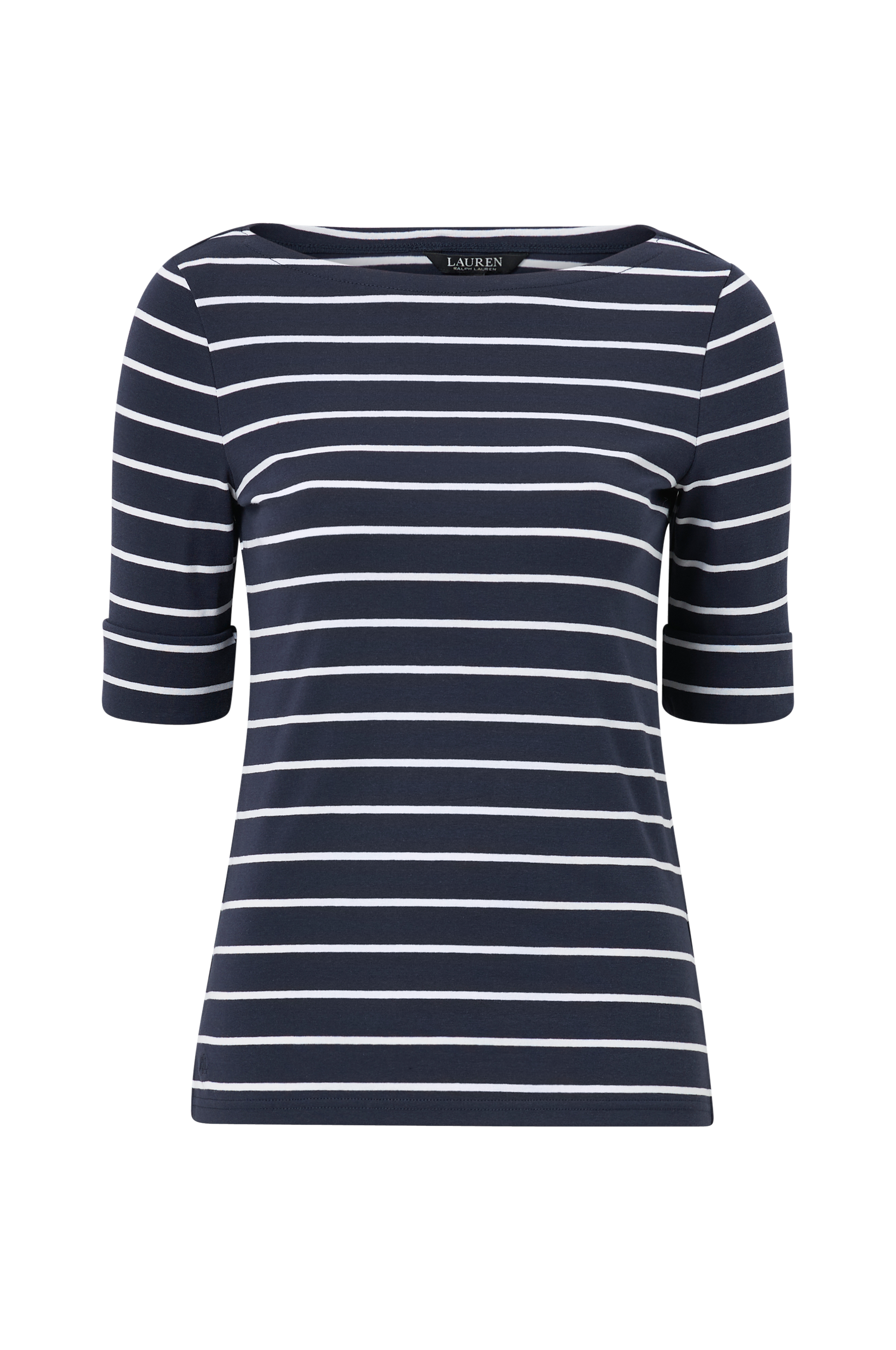 Let figursyet model med indvævede striber. Bådudskæring i halsen og halvlangt ærme med fast opslag i ærmekant samt lille slids forneden i siderne.