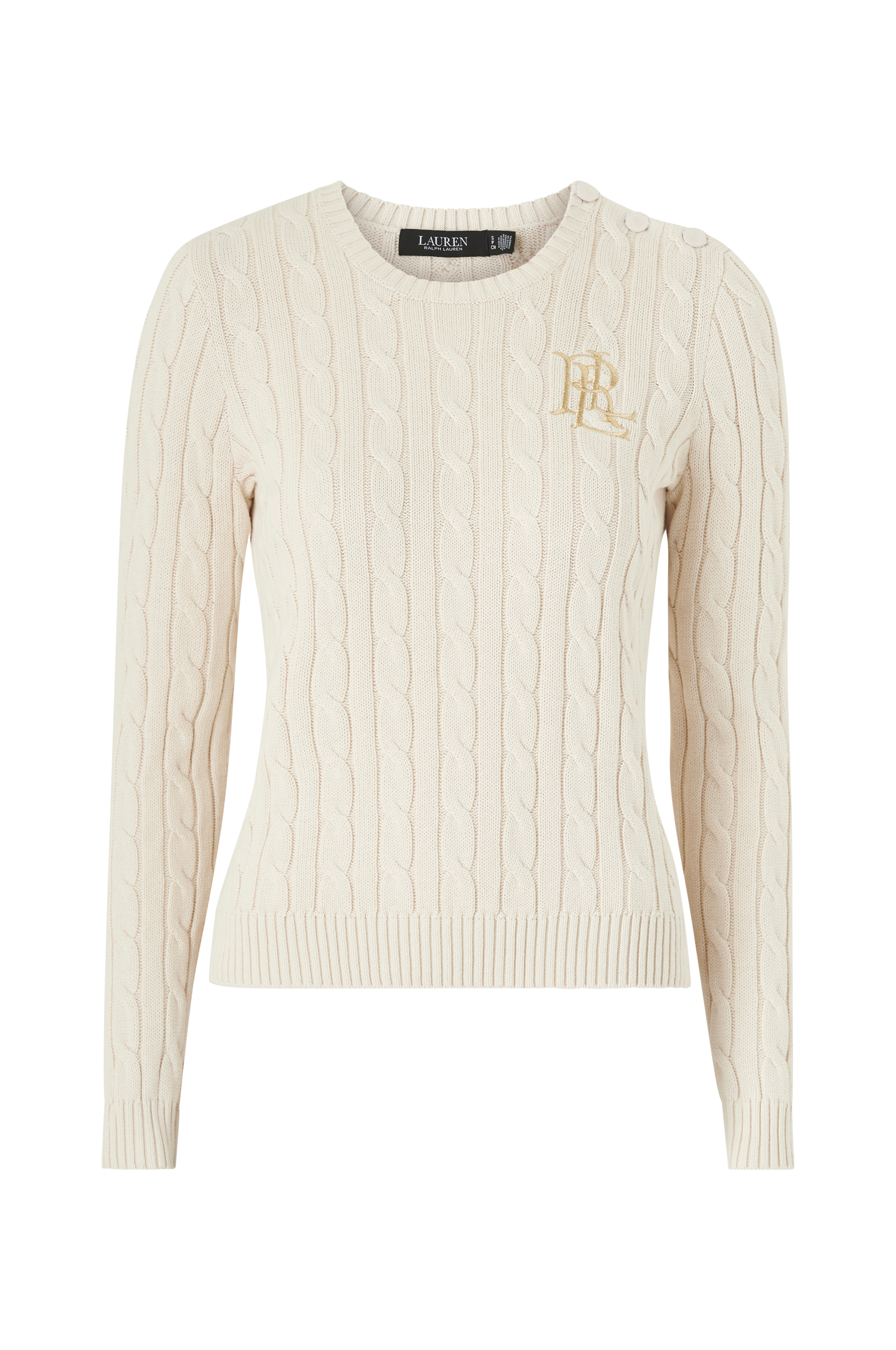 • Kabelstrikket trøje• Sølvagtigt, broderet logo på brystet• Knapper på en skulder