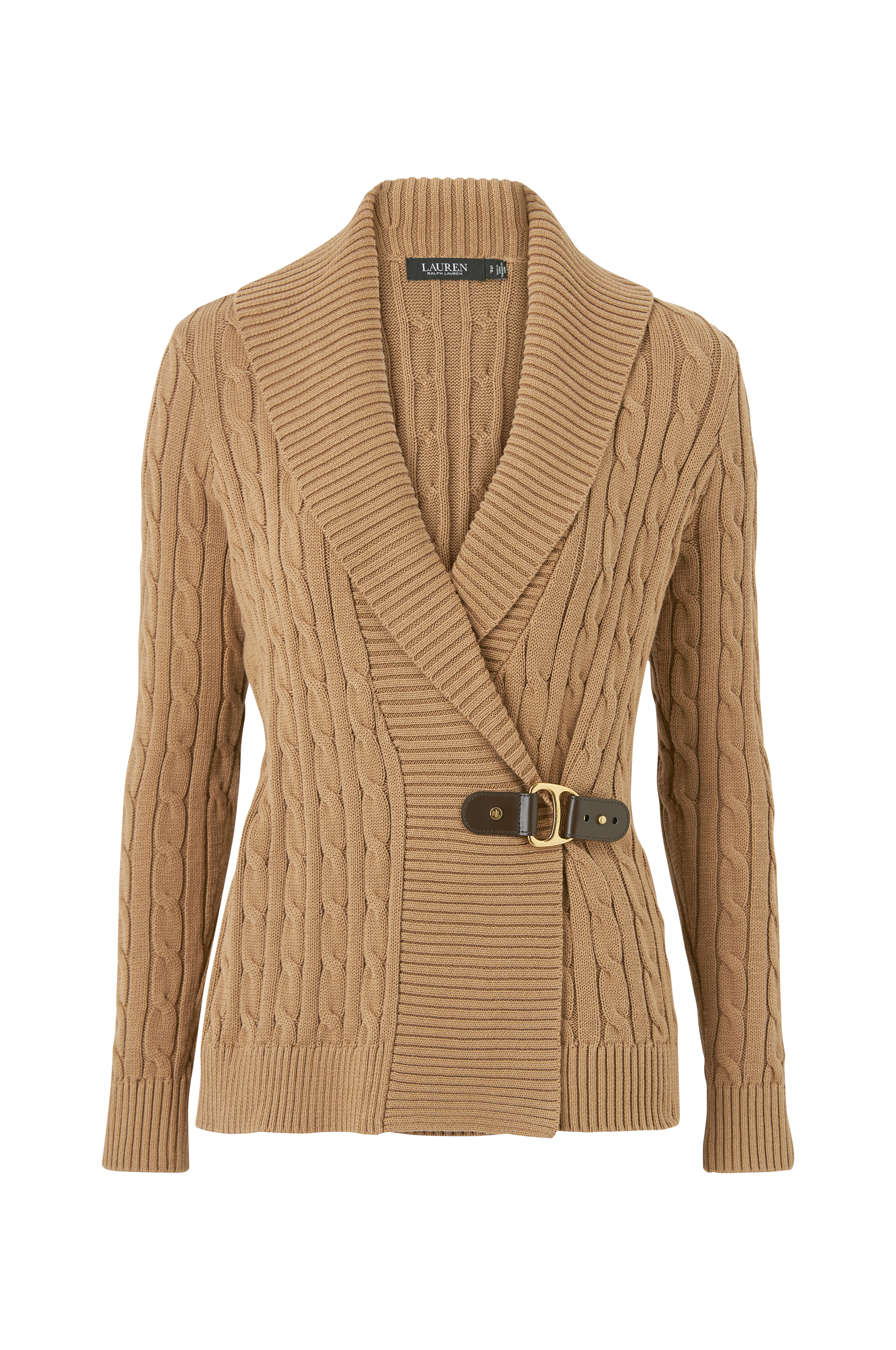 Kabelstrikket, stilren trøje med ribstrikket sjalskrave. Slå om-model som er fastsyet i siden på indersiden og har et løst slå om-lag med justerbart spænde i siden. Ribstrikket kant forneden og i ærmekant.
