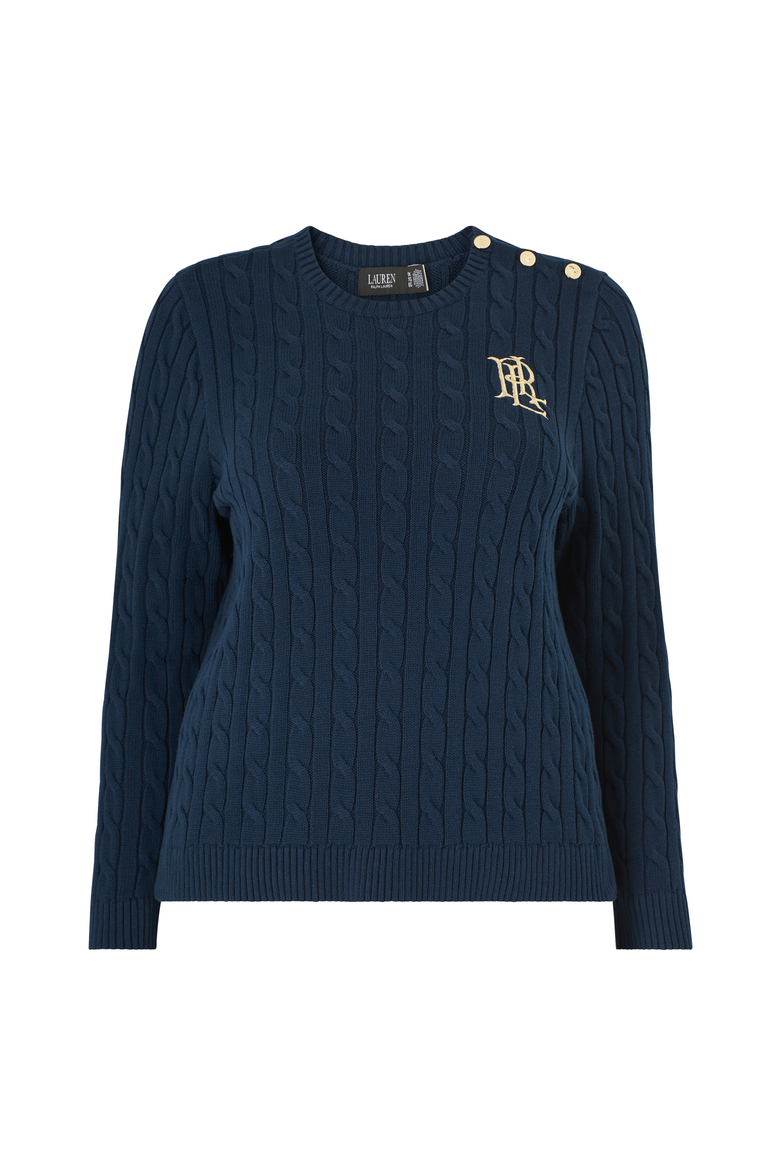 • Store størrelser• Kabelstrikket model• Rund hals• Åbning med guldfarvede knapper på en skulder• Guldfarvet logobroderi på brystet• Ribstrikkede kanter