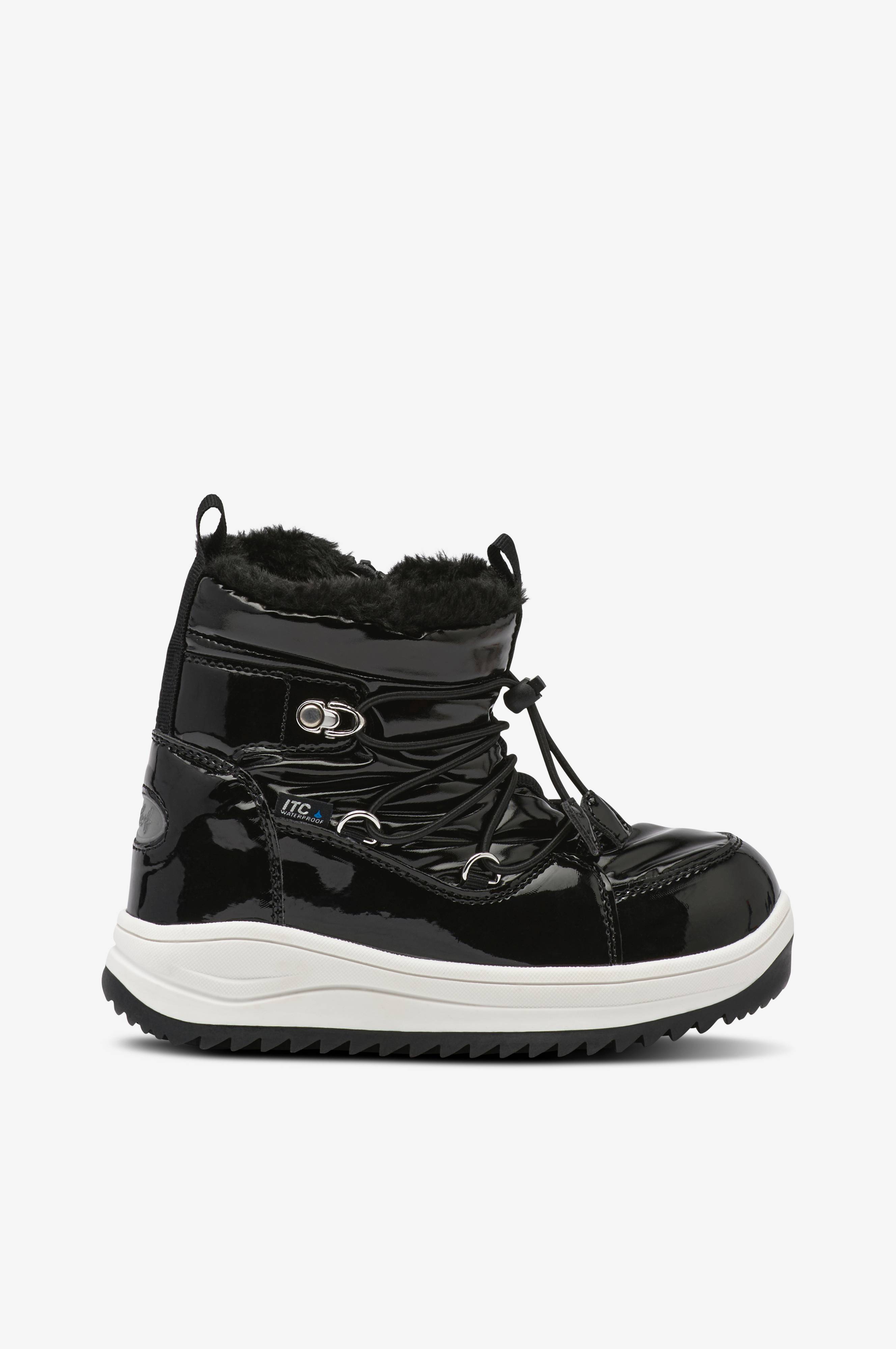 • Vandtætte, varmt forede vinterstøvler i blankt tekstil med forstærkninger i kunststof• Blødt for i fleece• Imiteret pelskant på toppen• Bred, elastisk snøring med stopper• Lynlås på siden• Reflekterende detaljer