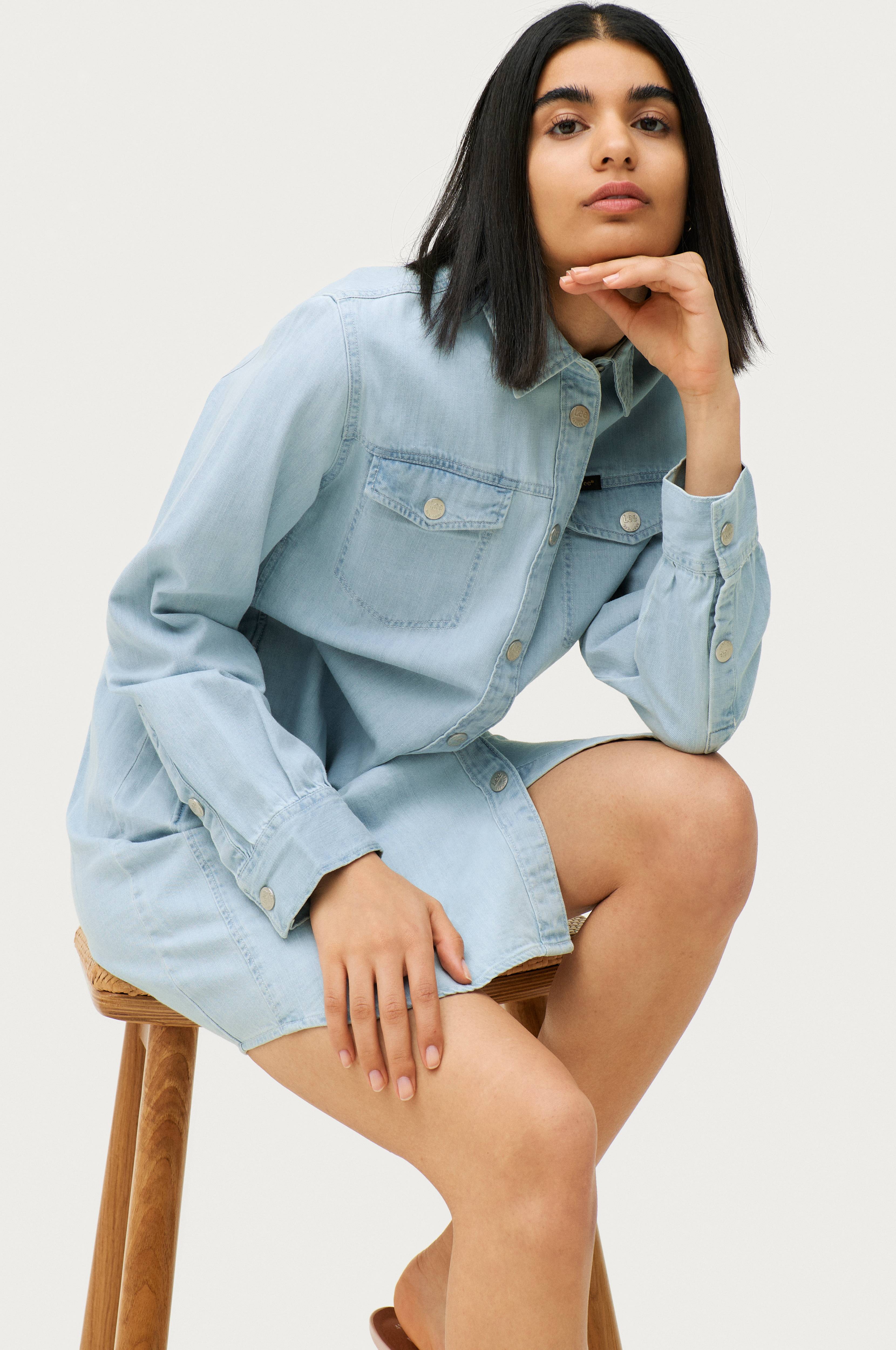 • Skjortekjole i denim• Trykknapper foran• To brystlommer• To sidelommer• Langt ærme med manchet• Længde: 95 cm i størrelse S