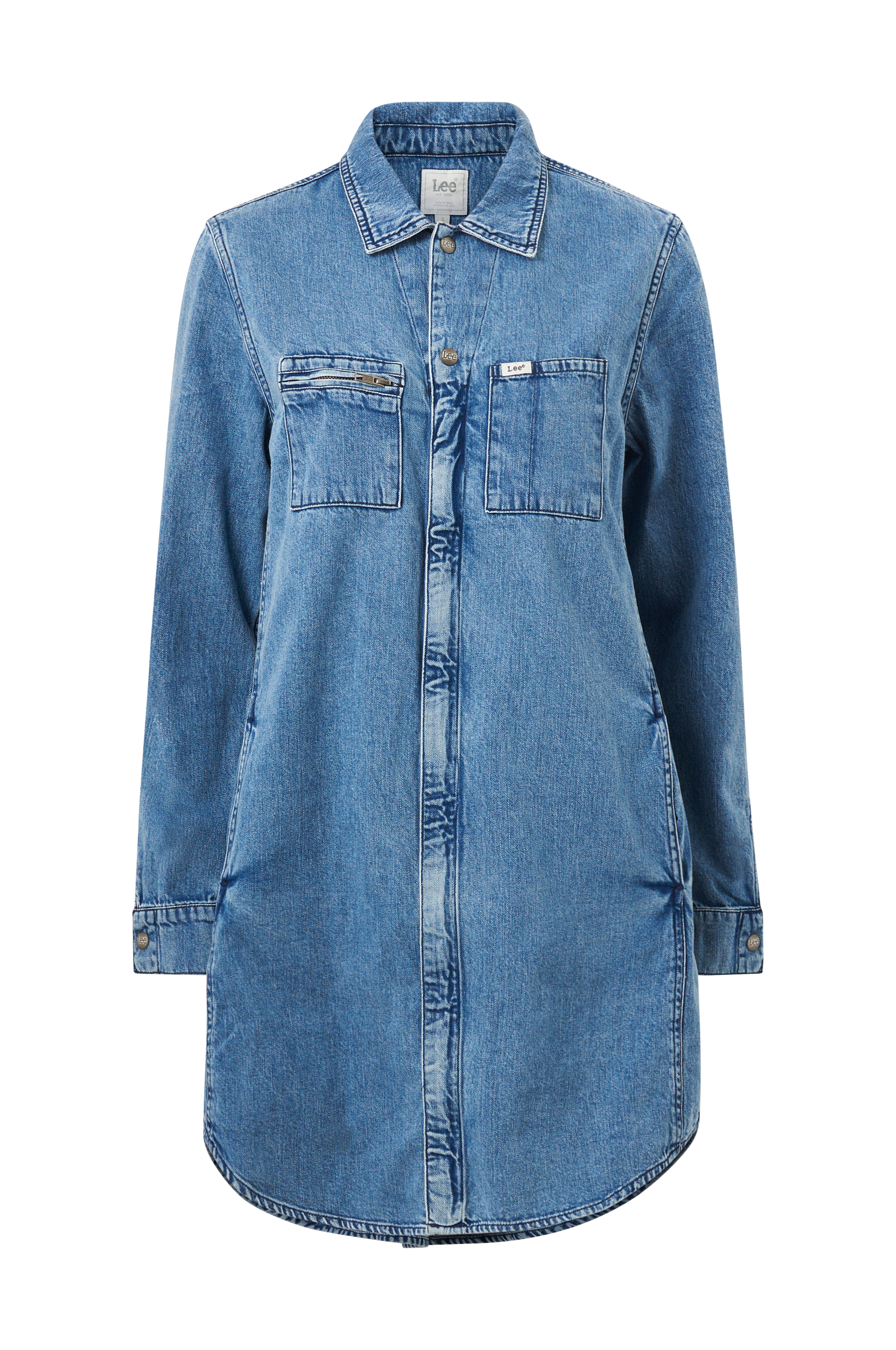 Denimkjole i bomuldsdenim. Skjult lynlås og lommer i siderne. To brystlommer heraf en med lynlås. Trykknap i ærmekant. Længde ca. 95 cm i str. S.