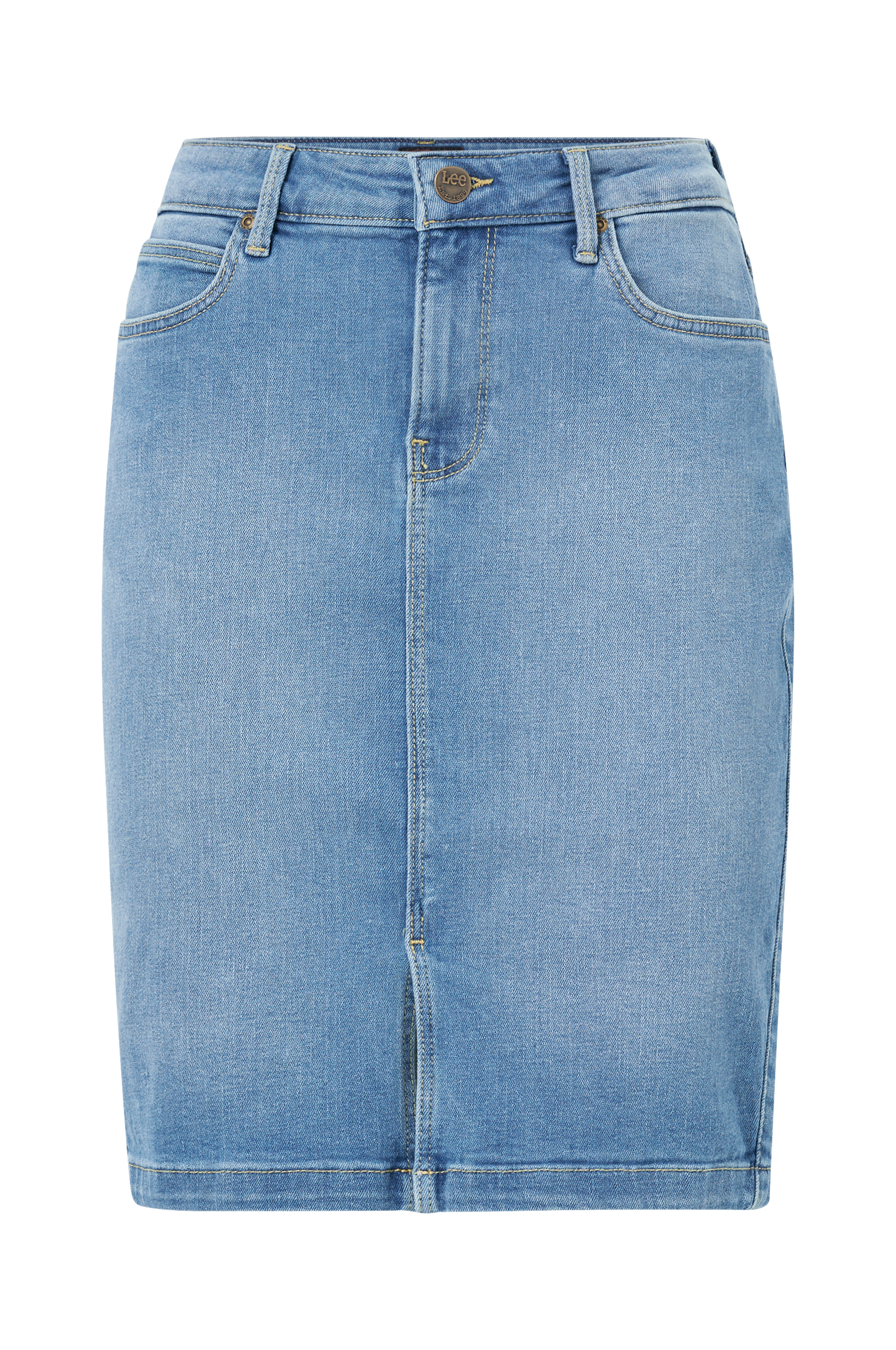 Denimnederdel i stretchdenim. Lige 5-lommemodel. Linning med stropper og knap. Gylp med lynlås og slids forneden foran.