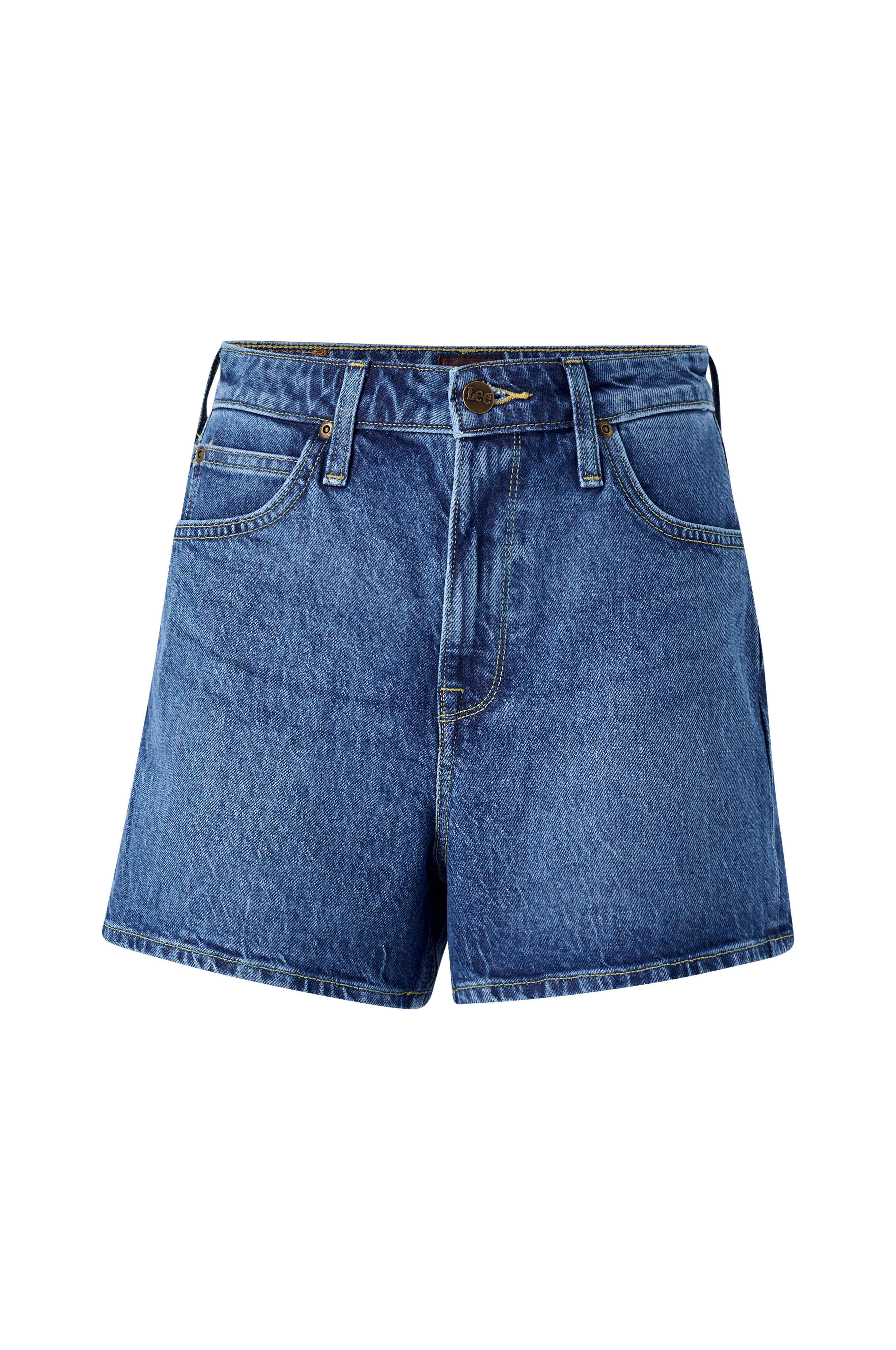 Model med høj talje og korte, vide ben. Lynlås foran og tre lommer foran samt to påsyede baglommer. Benlængde ca. 8 cm i str. 27.