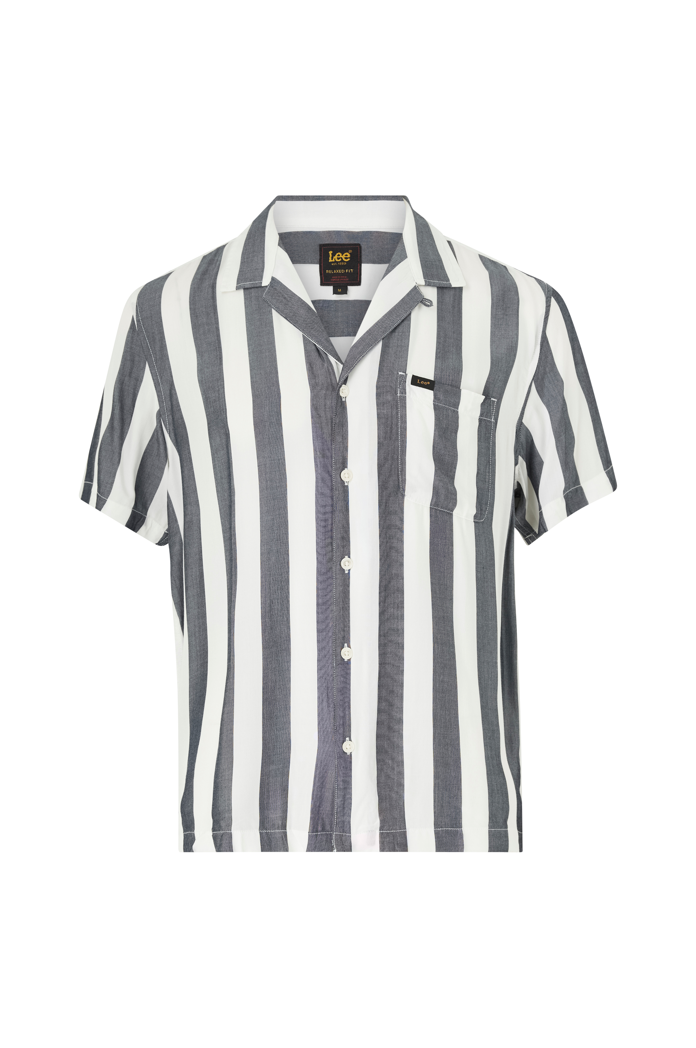 • Stribet skjorte i viskose med revers og v-hals• Korte ærmer• Brystlomme