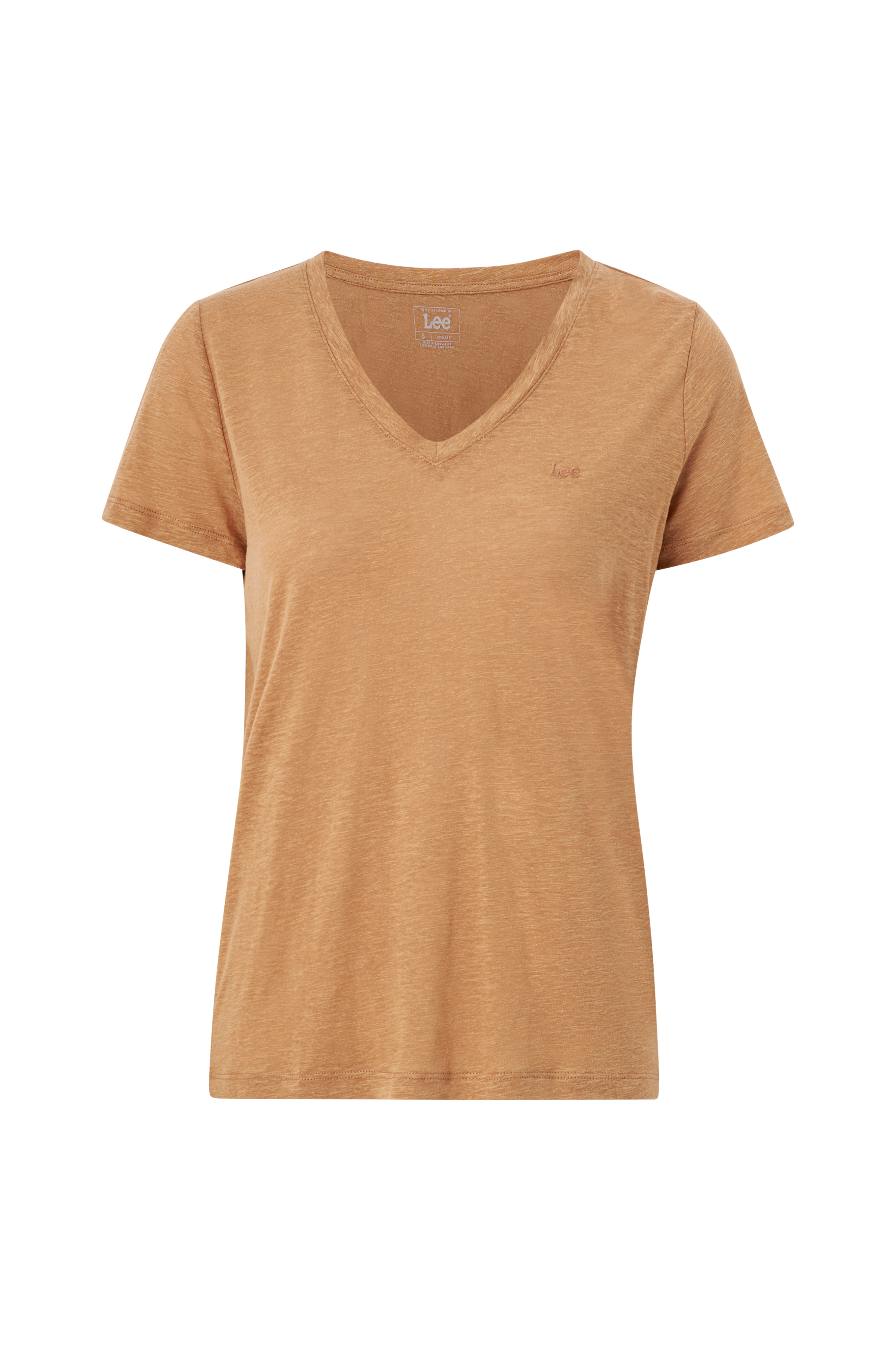 Kortærmet top i met let og blød kvalitet af lyocell og hør. V-hals og broderet logo på brystet.