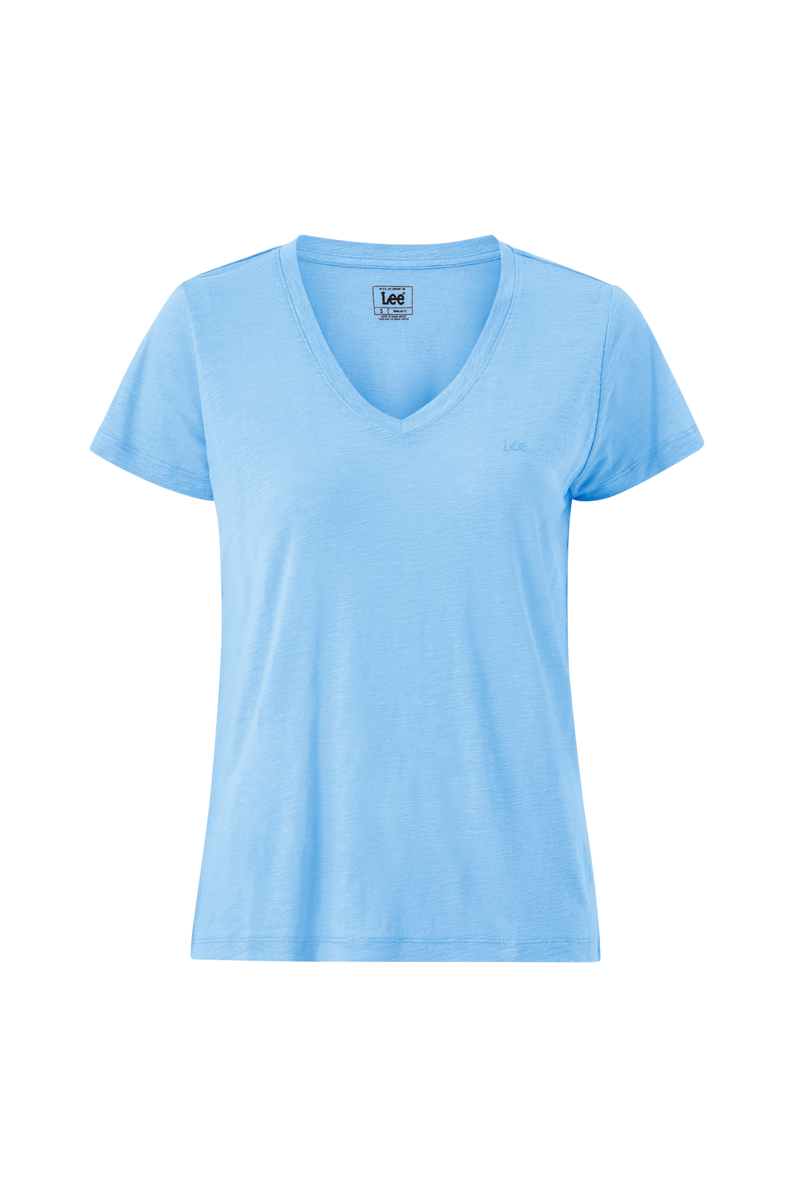 Kortærmet top i met let og blød kvalitet af lyocell og hør. V-hals og broderet logo på brystet.
