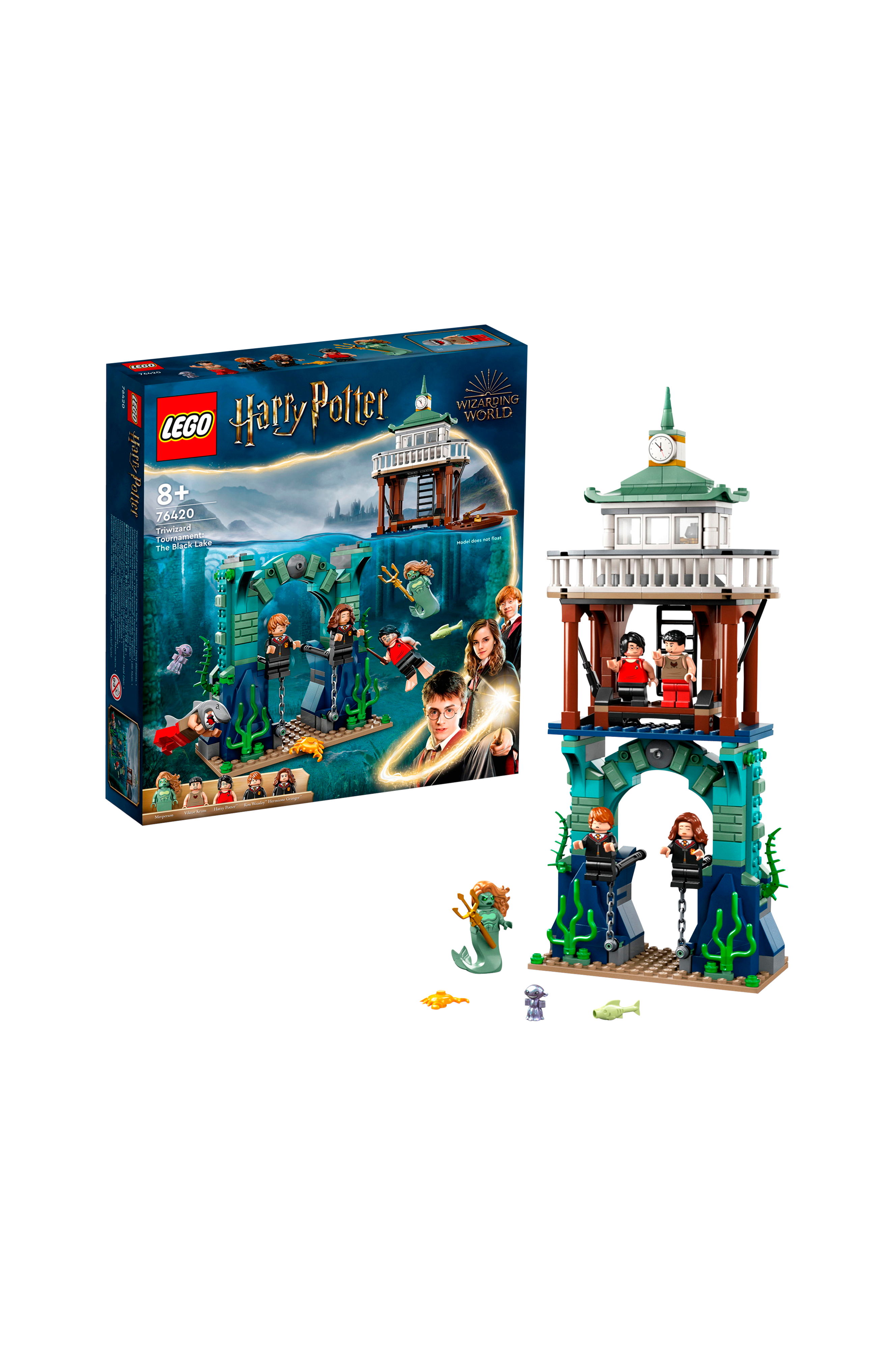 Ikoniske figurer fra Harry Potter og flammernes pokal med 5 minifigurer, herunder Harry Potter med svømmefødder og Viktor Krum med hajhoved, som hjælper dem med at redde Hermione Granger™ og Ron Weasley™.