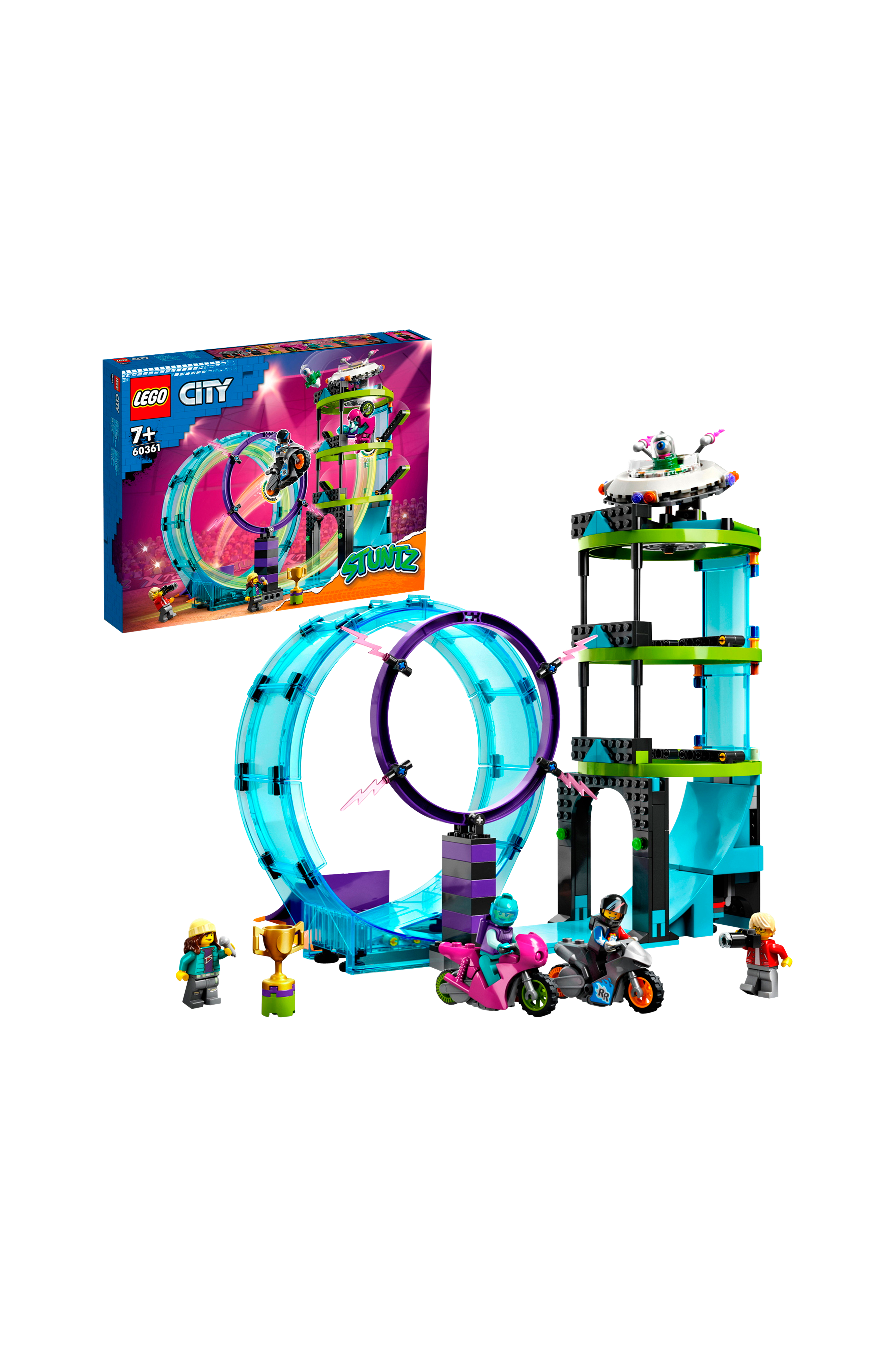 Dette sæt med 3 funktioner indeholder 2 stuntmotorcykler og 3 stuntelementer, der kan kombineres - et 360°-loop, en ildring og en sjov udfordring med et "rumvæsentårn".