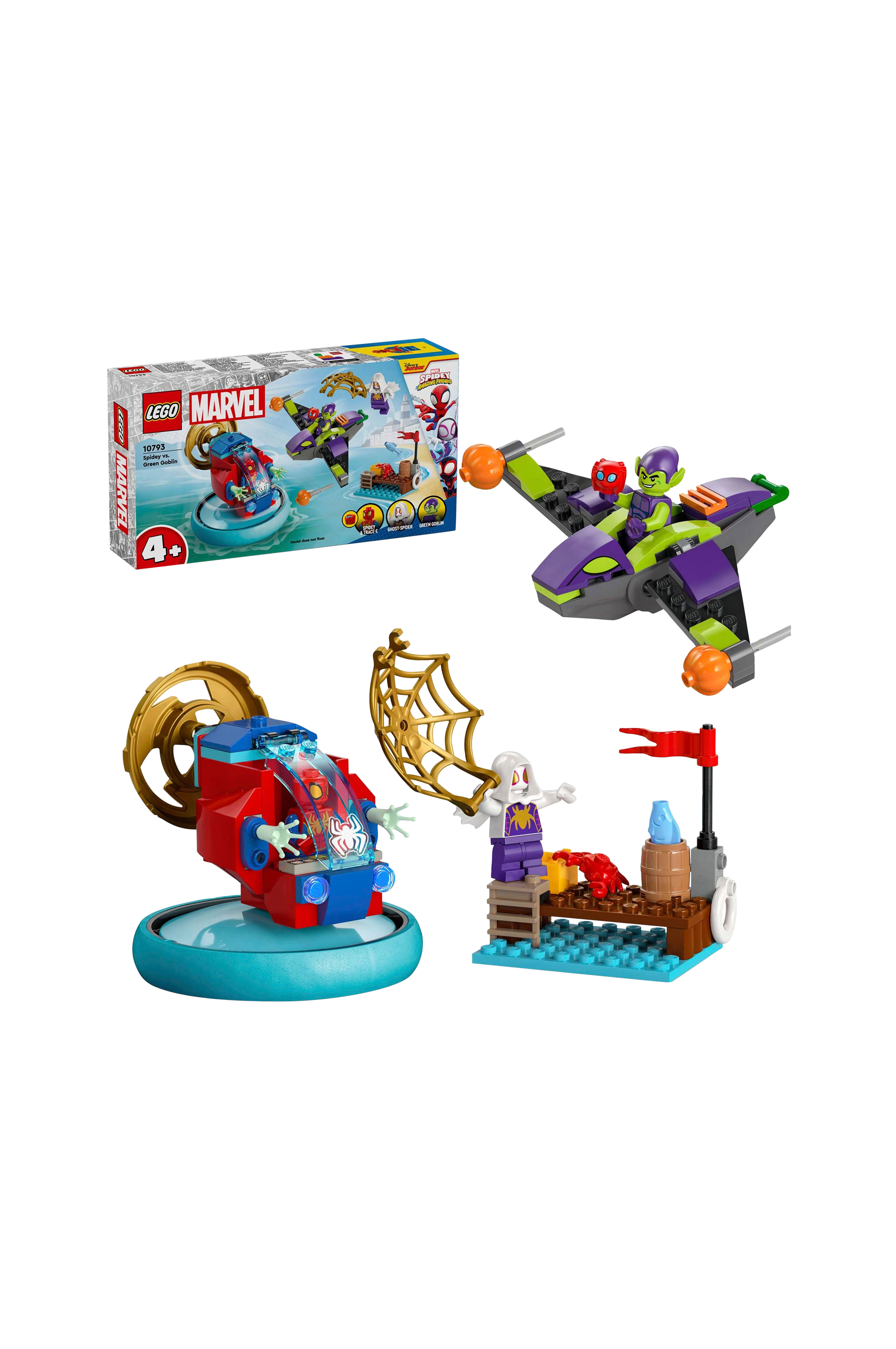 Dette Marvel Spider-Man-legetøj er designet til at opbygge selvtillid, forbedre problemløsningsevner og inspirere til endeløs fantasifuld leg for både piger og drenge. Sættet indeholder en minifigur af Spidey med et hoverboard med roterende propel og et cockpit, der kan åbnes, en minifigur af Green Goblin med en svæveflyver og græskarprojektiler og en minifigur af Ghost-Spider med et stort gyldent spindelvæv.