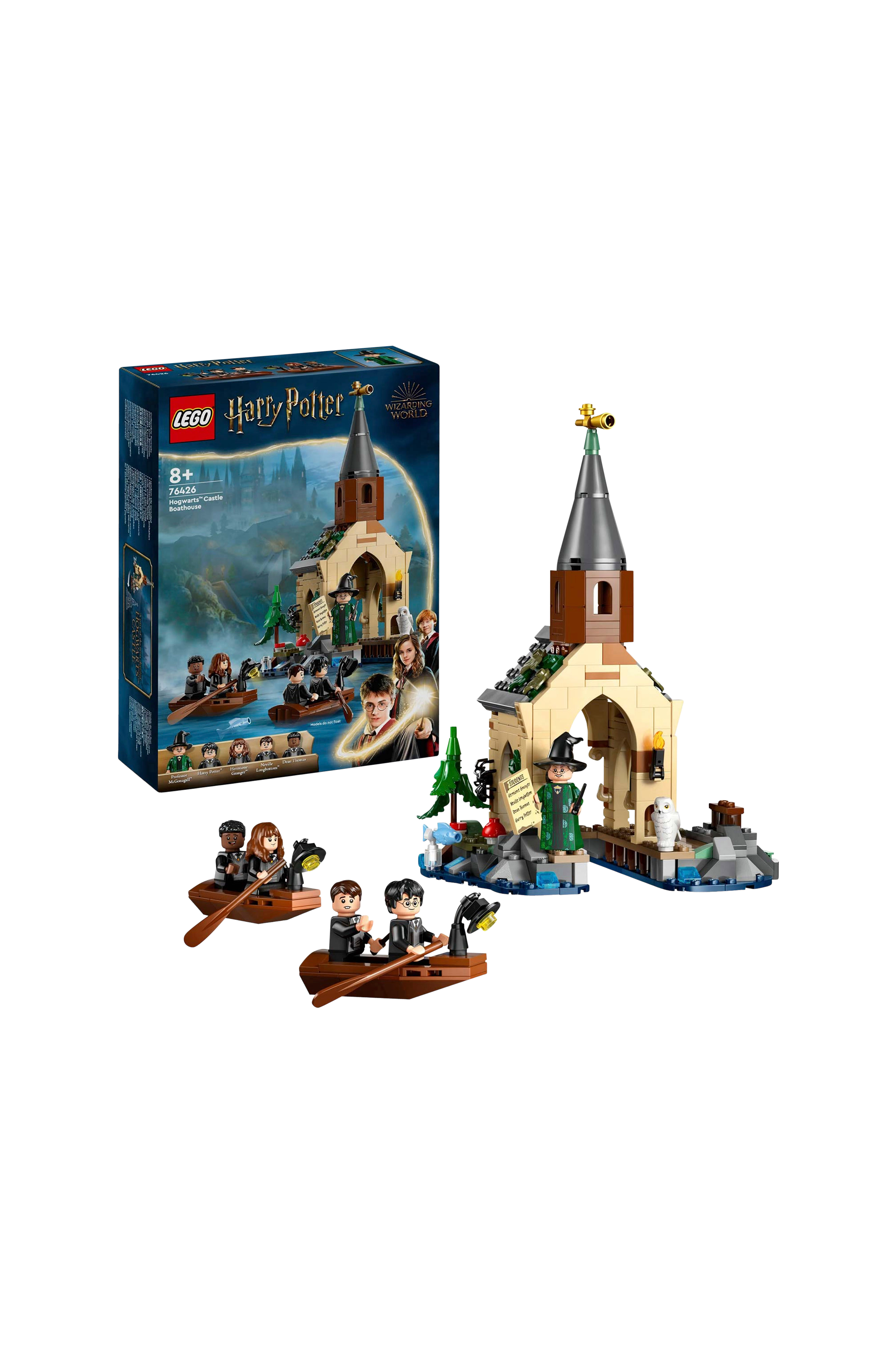 Sættet indeholder to både, der kan bygges, med plads til to figurer i hver, et bådehus til at lægge til, Neville Longbottoms tudse Trevors gemmested og et af 14 Hogwarts-portrætter, der kan samles.