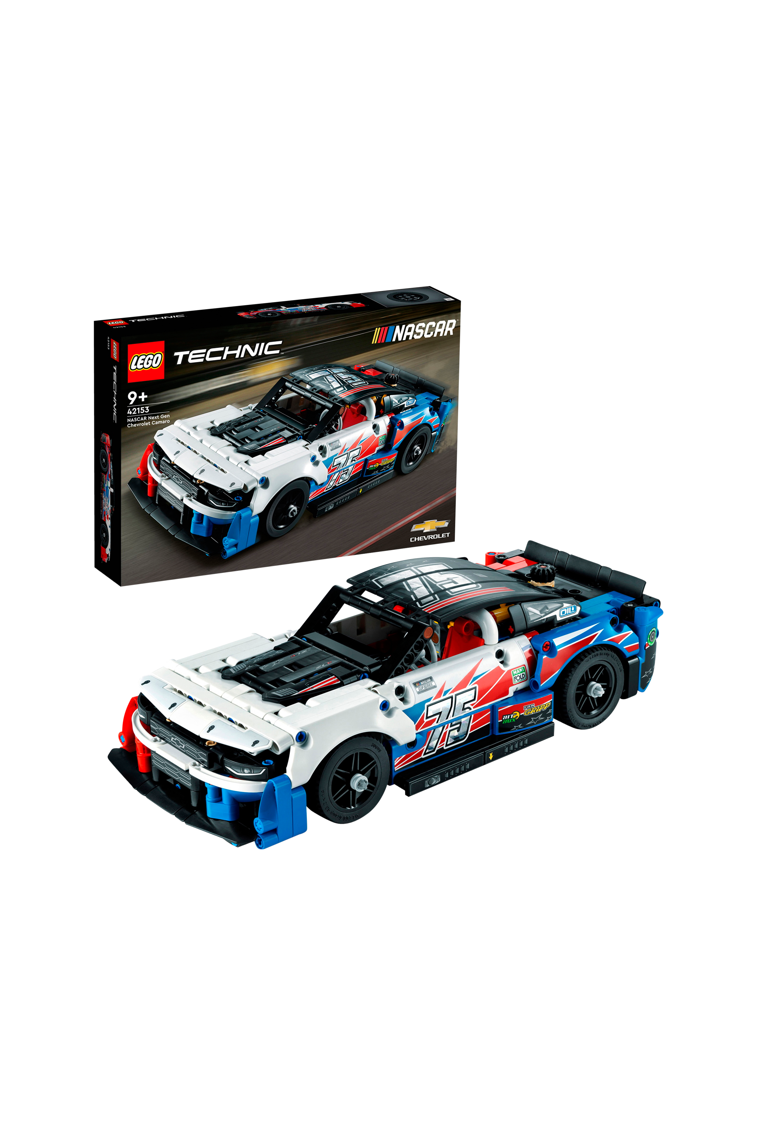 Byggesæt med racerbil, hvor du kan udforske bilens realistiske funktioner, såsom styringen, motorhjelm, der kan åbnes, og V8-motor med bevægelige stempler.