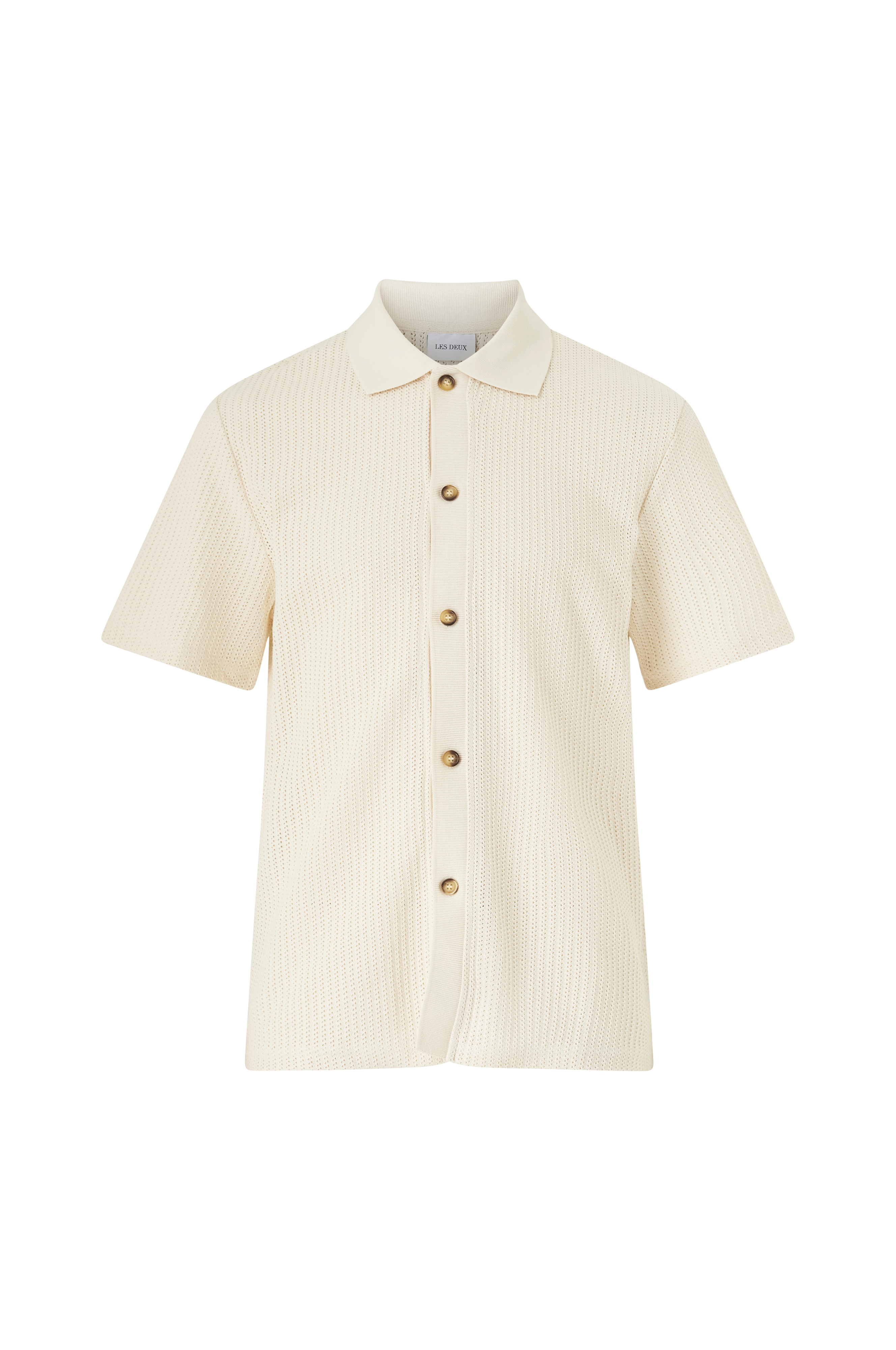 • Skjorte med hulmønster hele vejen rundt• Ribbet krave• Ribbet knaplukning foran• Kortærmet