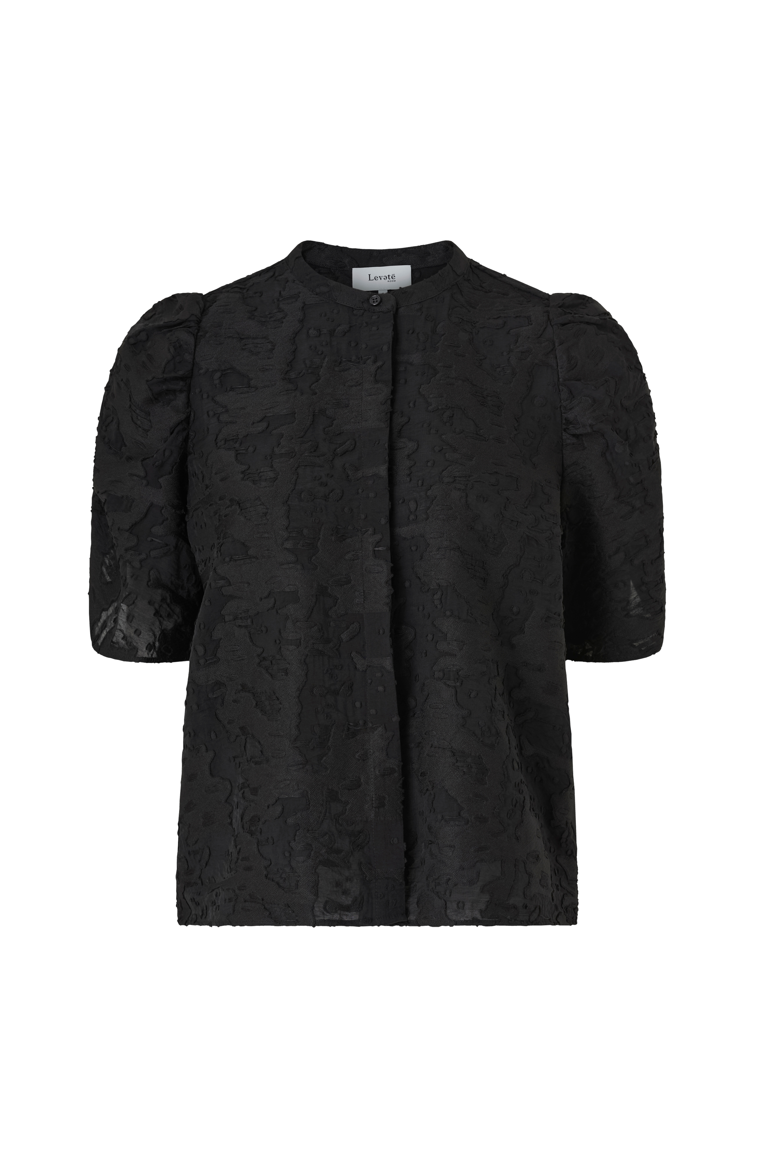• Lige, jacquardvævet model• Rund hals• Skjulte knapper hele vejen frem• Kort ballonærme med elastisk drapering på oversiden