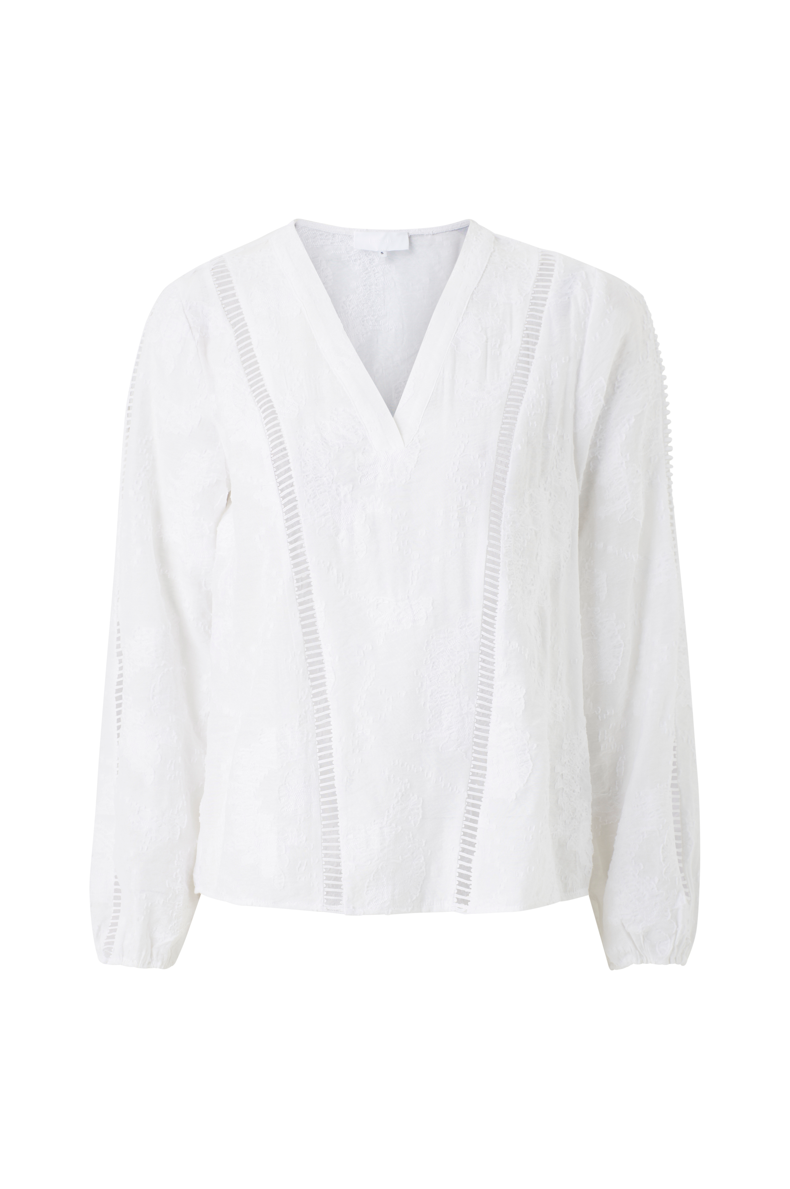 • Bluse med vævet strukturmønster• Hulmønstrede detaljer• V-udskæring• Lange ærmer med elastiske manchetter