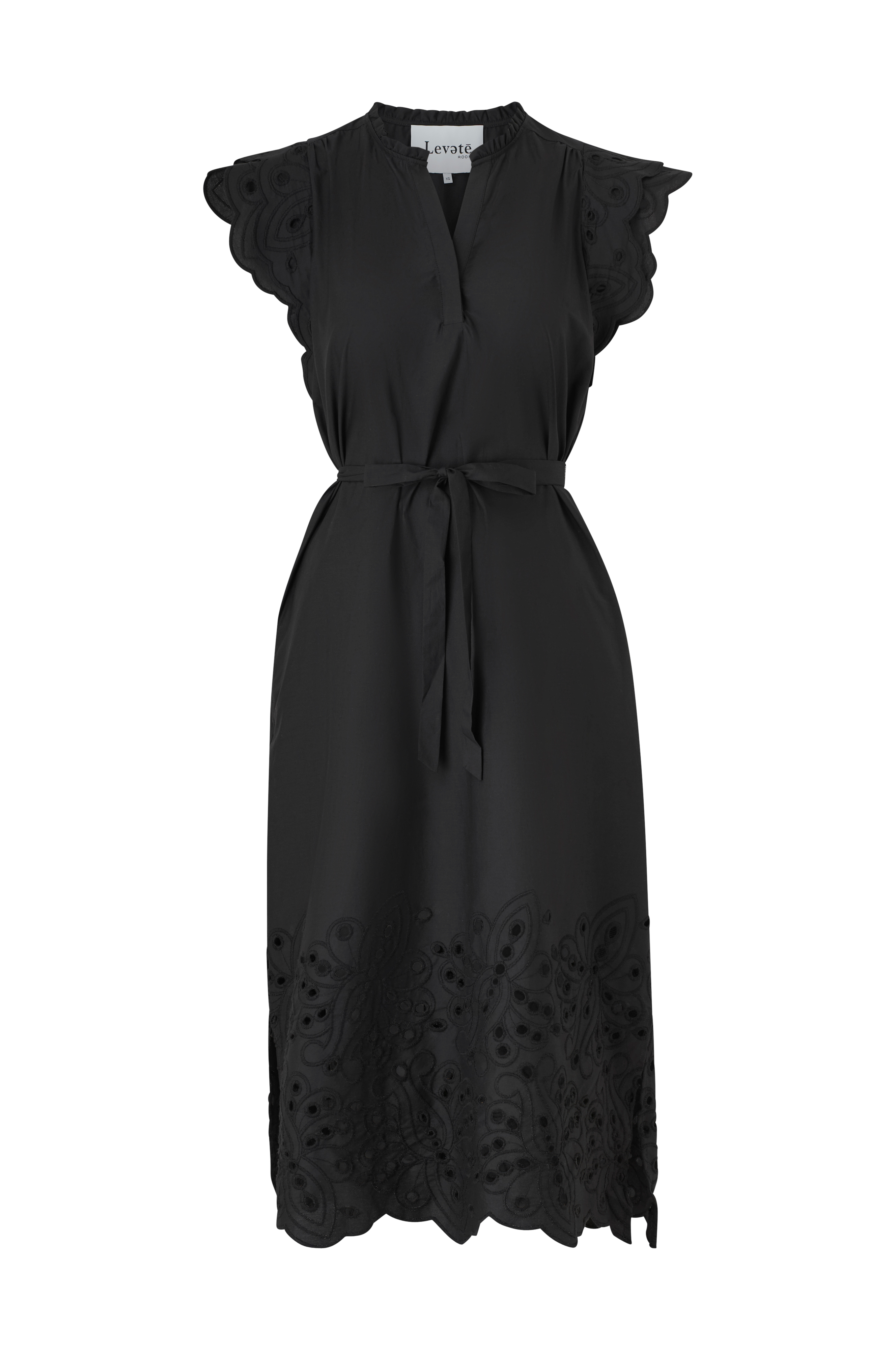 • Rund halsudskæring med lille volant og v-formet slids med to skjulte knapper • Korte ærmer med dobbelte volanter • Bindebælte ved taljen • Sidelommer • Slids nede i siderne • Hulbroderier på ærmerne og nederst • Længde: 118 cm i størrelse XS