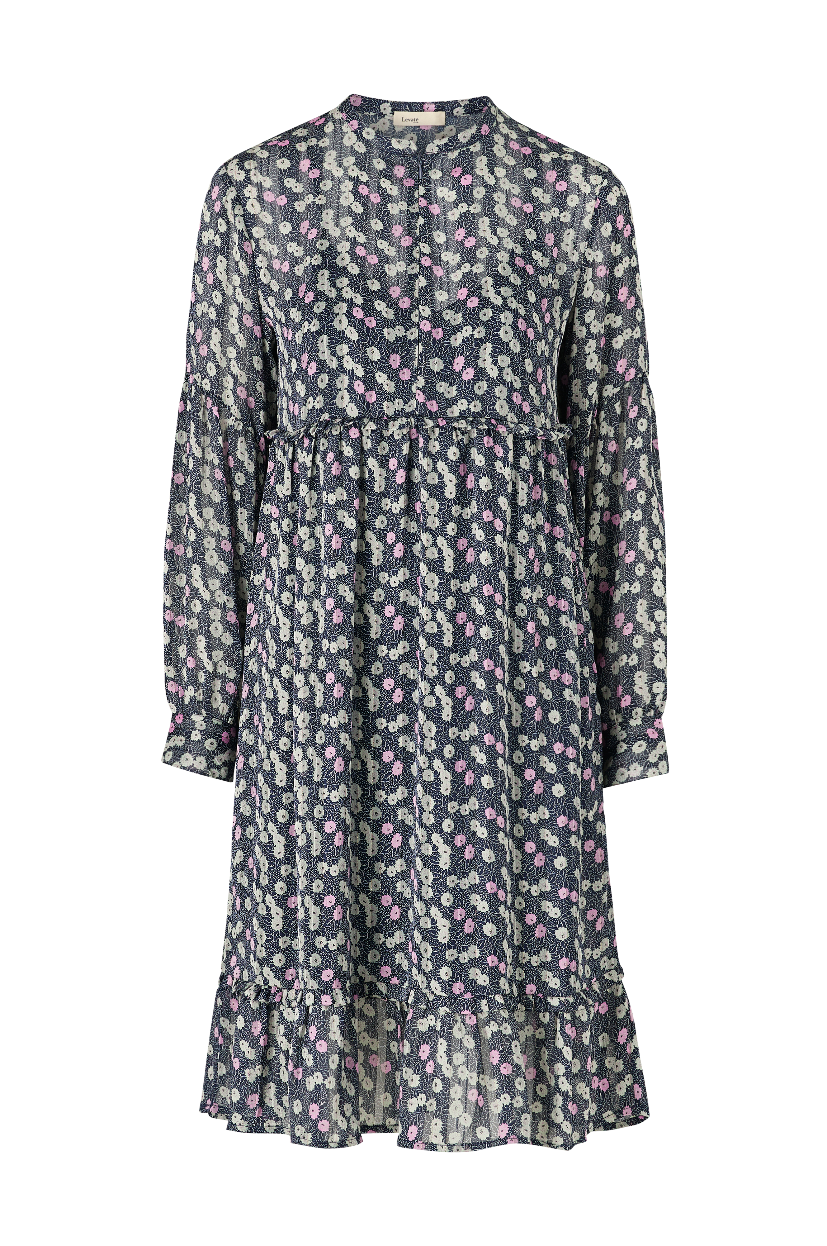 Kjole LR-Harvest 3 fra Levete Room. A-formet model med afskæring og lille flæse i taljen. Rund hals med lille kant og skjult lynlås foran på brystet. Langt ærme med afskæring ved albuen og ekstra vidde forneden samt manchet i ærmekant. Påsyet flæse i kant forneden på nederdel. Chiffon med indvævet guldtråd og udtagelig indvendig kjole med smalle, regulerbare skulderstropper. Længde ca. 104 cm i str. S.