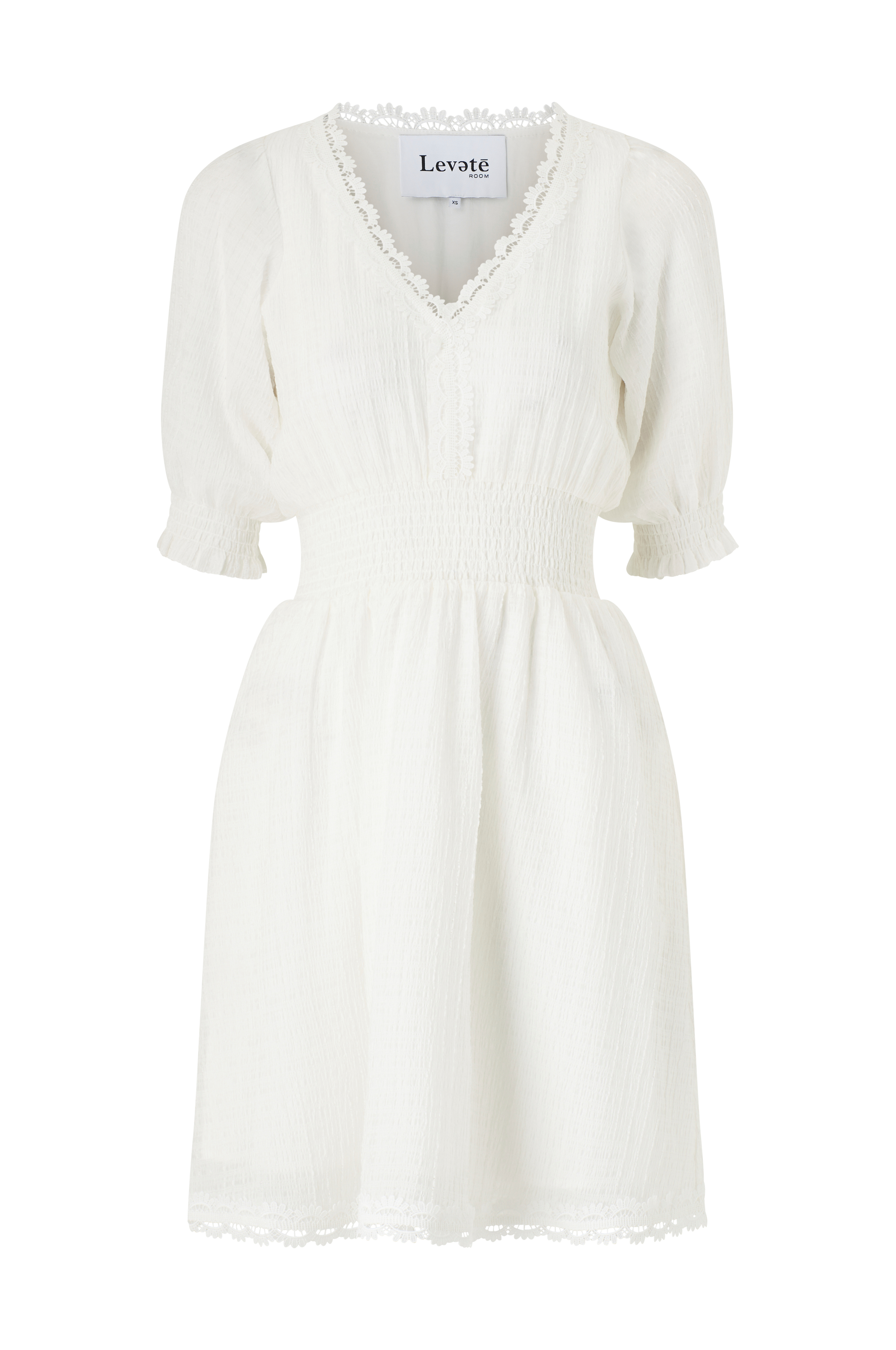• Kjole med struktur og inderfor• V-formet halsudskæring• Halvlange pufærmer• Smock ved taljen og ved manchetterne• Blondekant rundt om halsudskæringen og ved nederste kant• Længde: 95 cm i størrelse XS