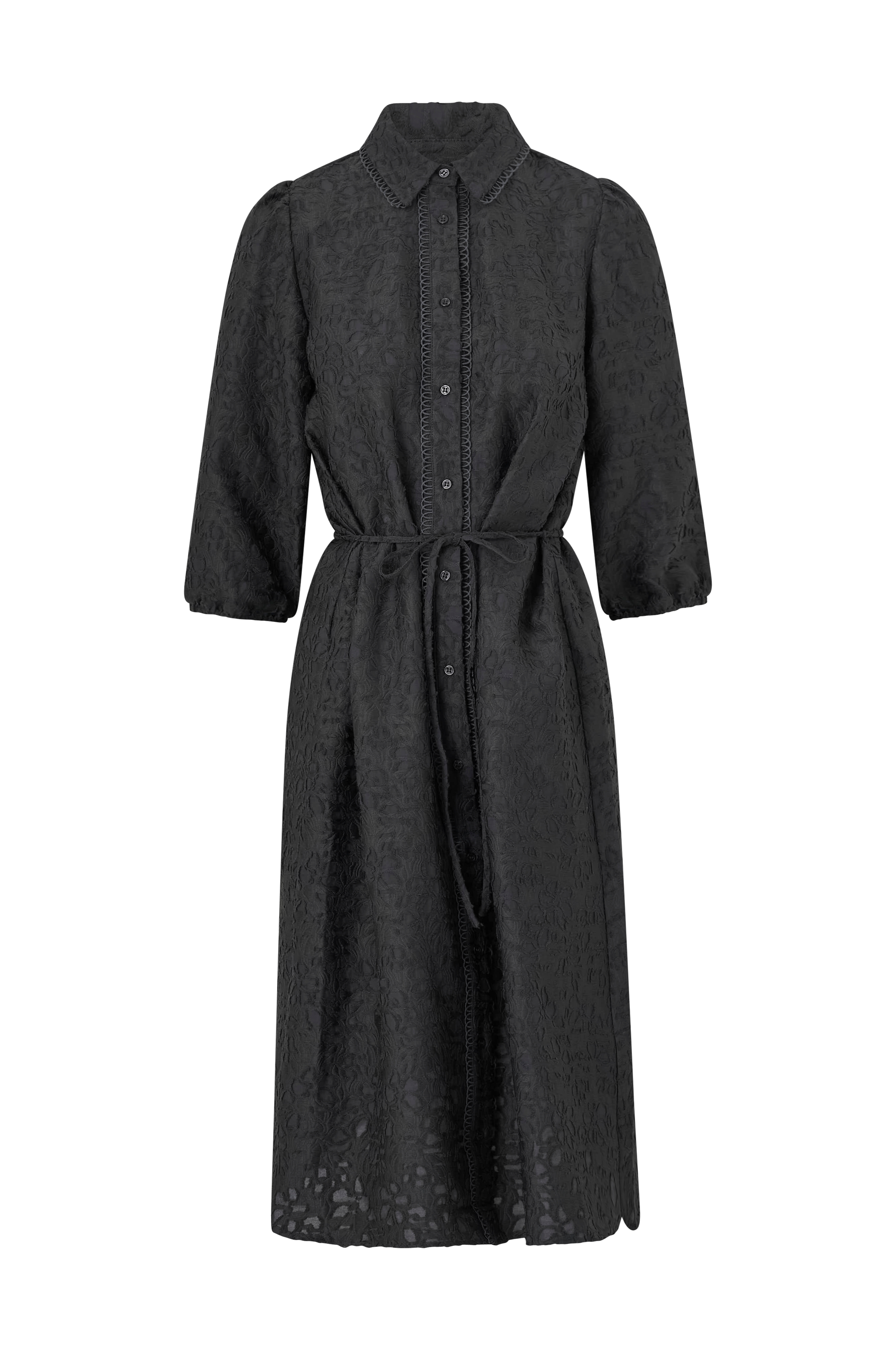 • Jacquardvævet model med svaj• Lille krave• Knaplukning foran hele vejen frem• 3/4 langt ballonærme med elastik ved manchetterne• Tyndt bindebælte• Defineret linning bagpå• Længde: 114 cm i størrelse XS