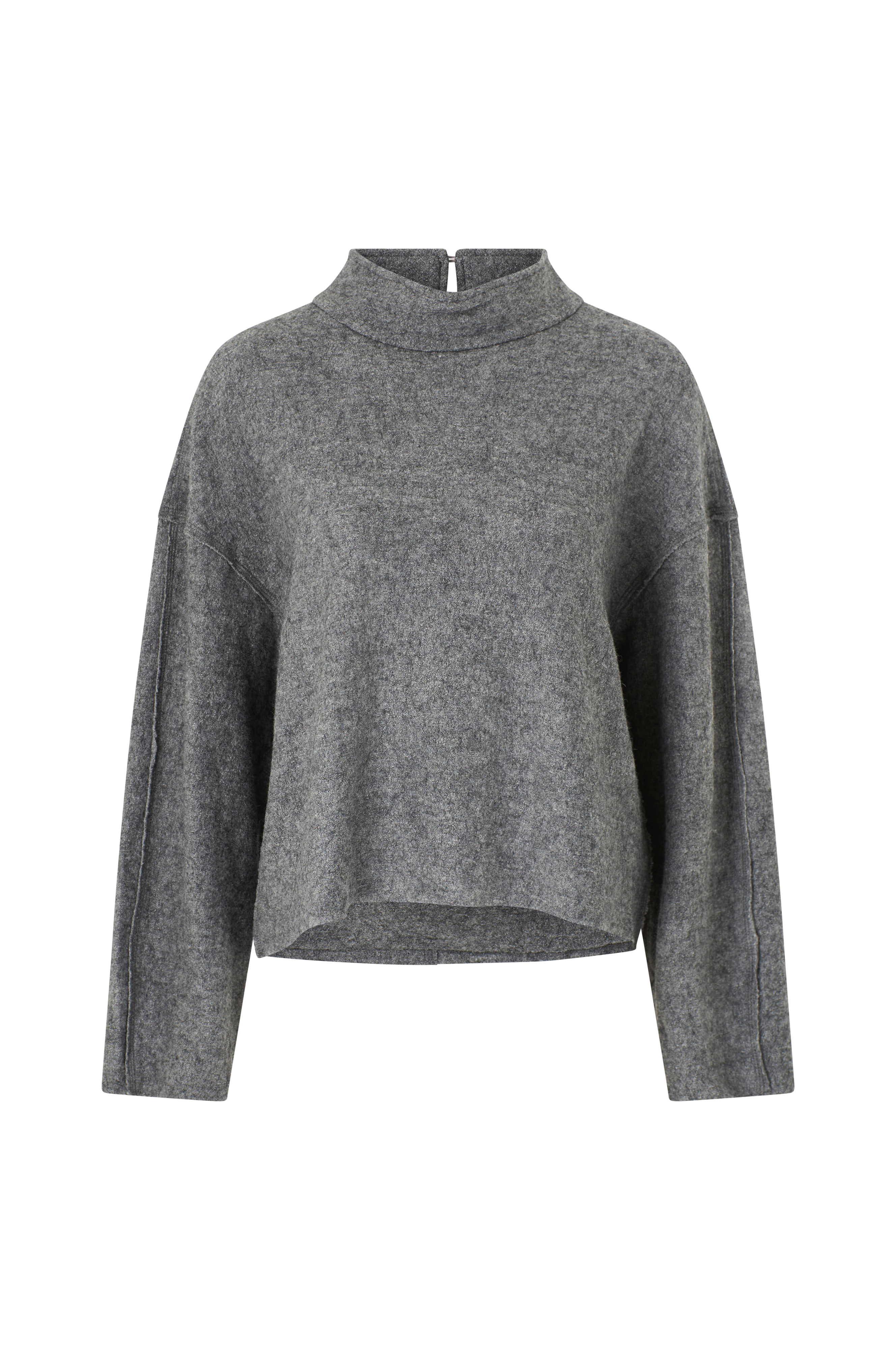 • Lige, bred model• Høj krave med knapper i nakken• Rå, dekorativt strikkede sømme• Nedsænket skulder med langt, lige ærme