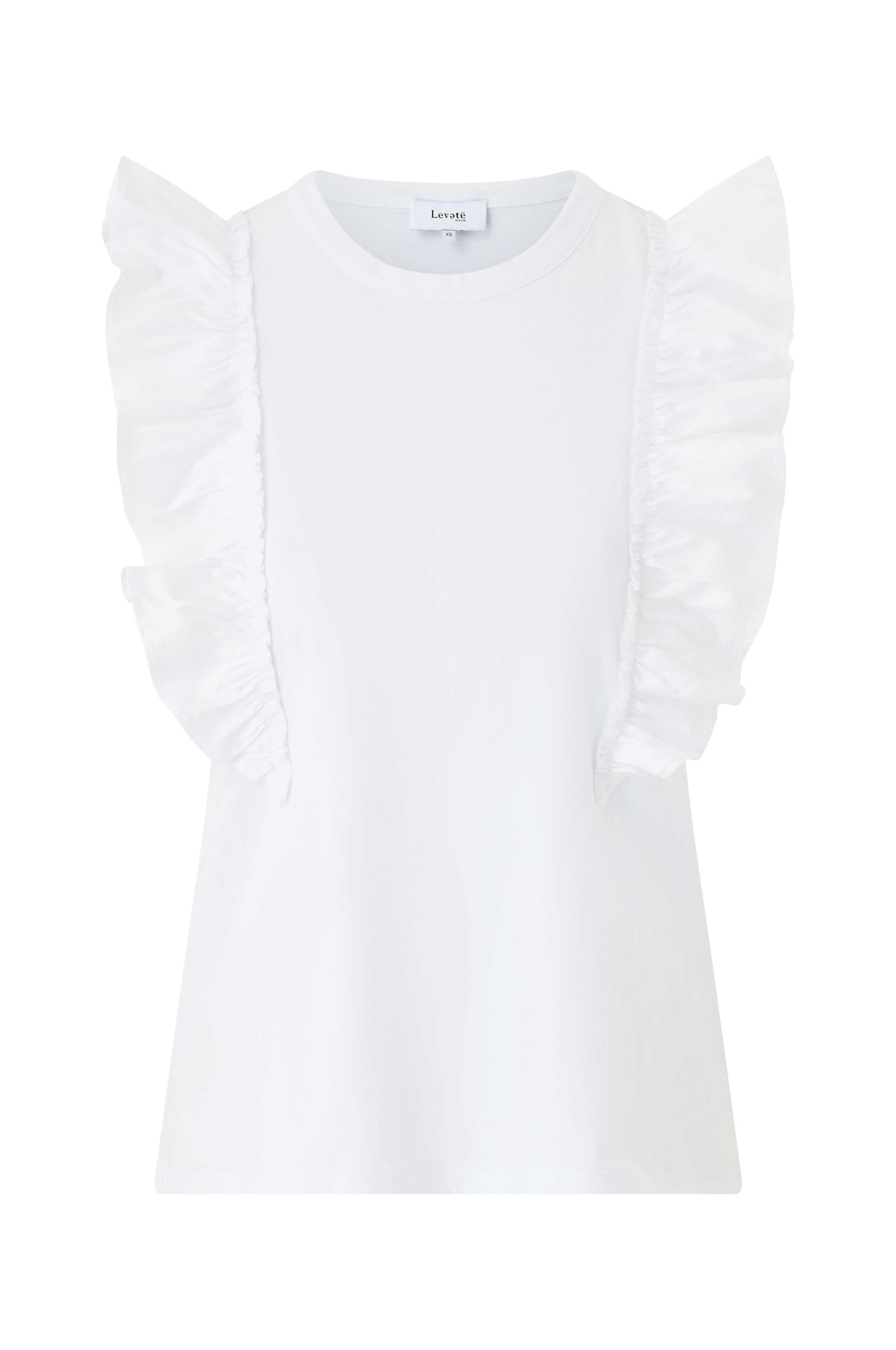 • Ærmeløs top i elastisk jersey• Rund hals• Vævede volanter omkring skuldrene