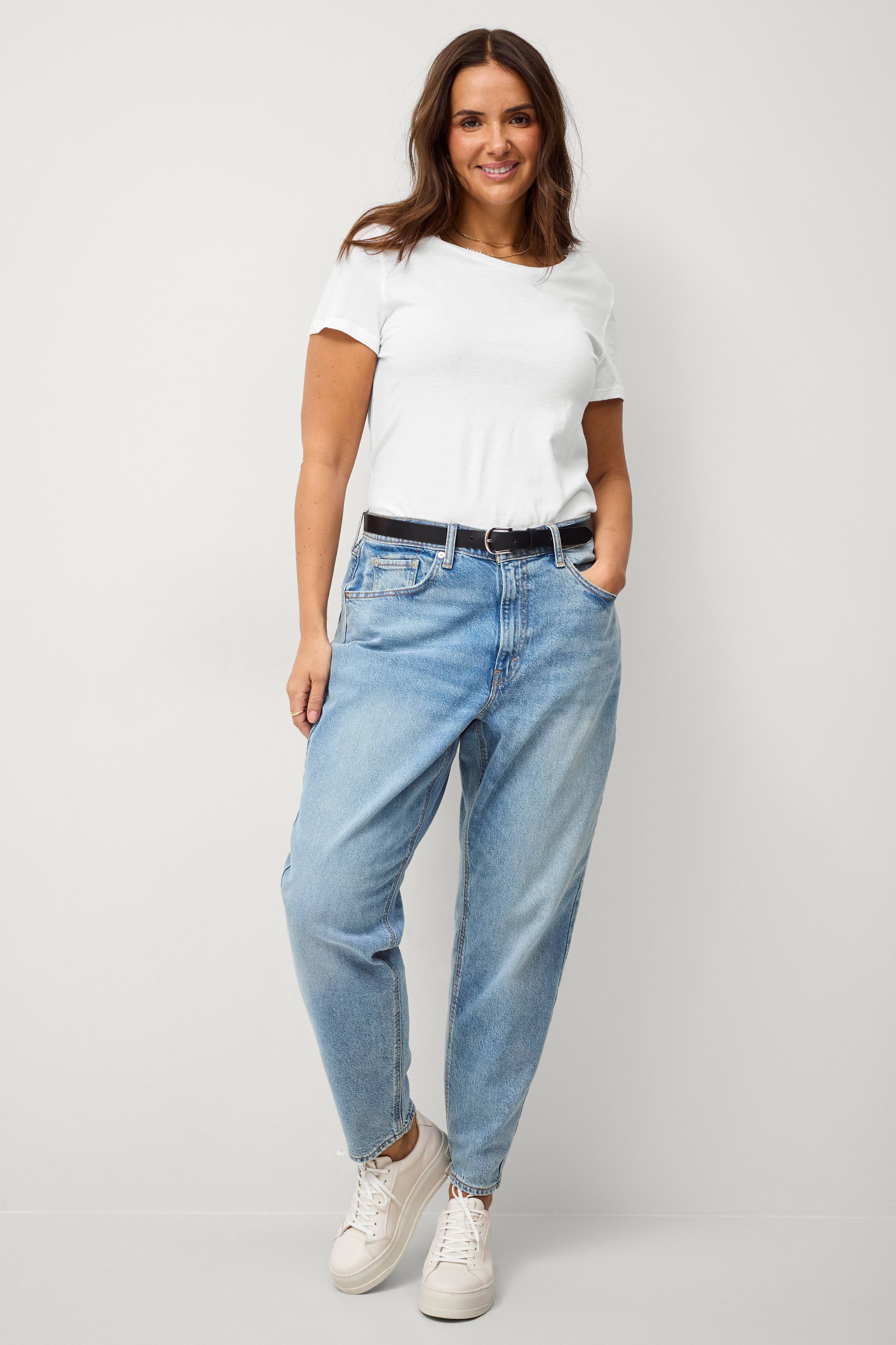 • Høj talje• Afslappet pasform• Indsnævrende ben• Femlommemodel• Strækdenim• Store størrelser• Jeansene kan føles store i størrelsen, så du er velkommen til at gå en størrelse ned i forhold til dit sædvanlige valg.