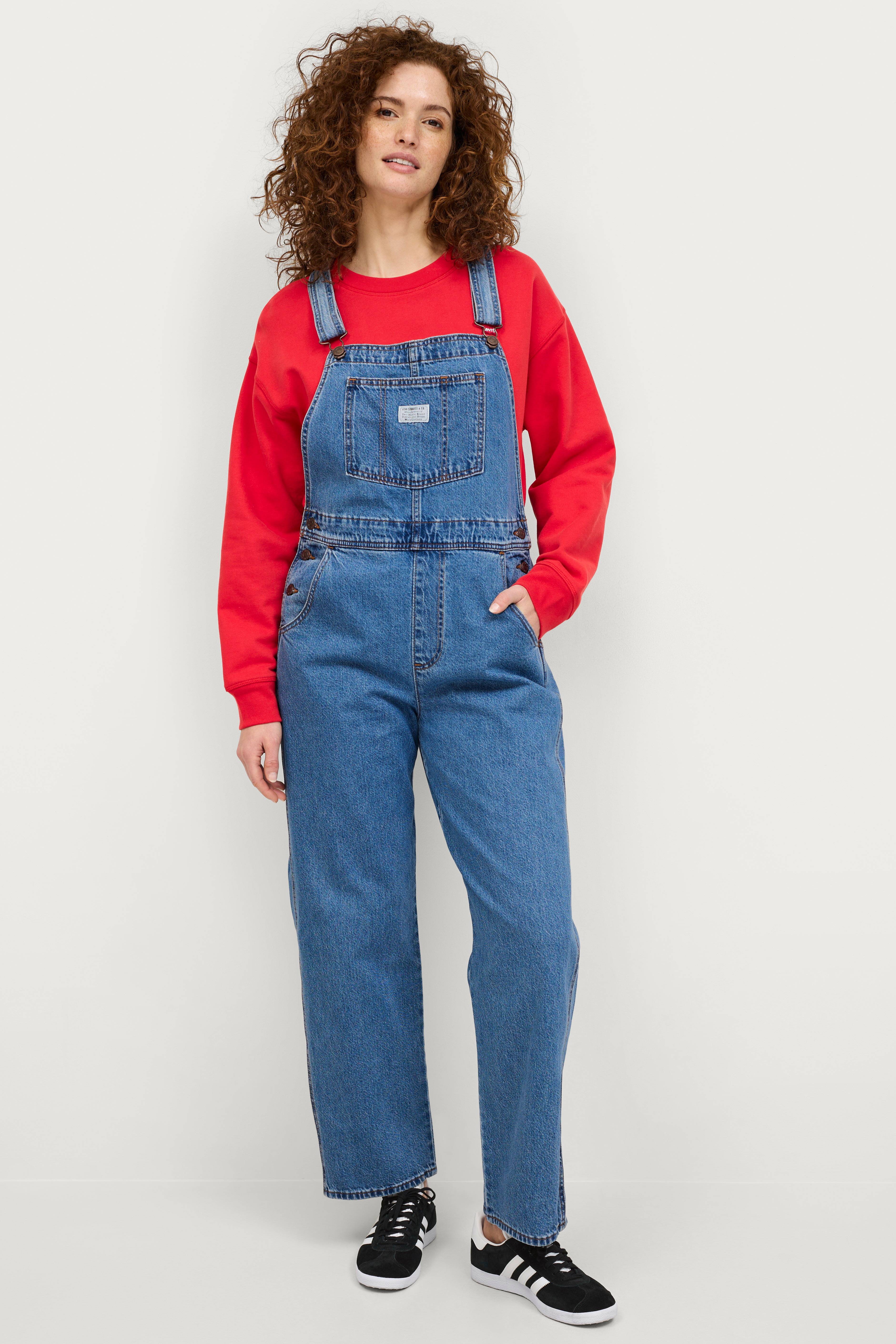 • Fremstillet af bomuldsdenim• Justérbare seler• Knapper i siderne• To baglommer• Sidelommer• Lomme midt foran