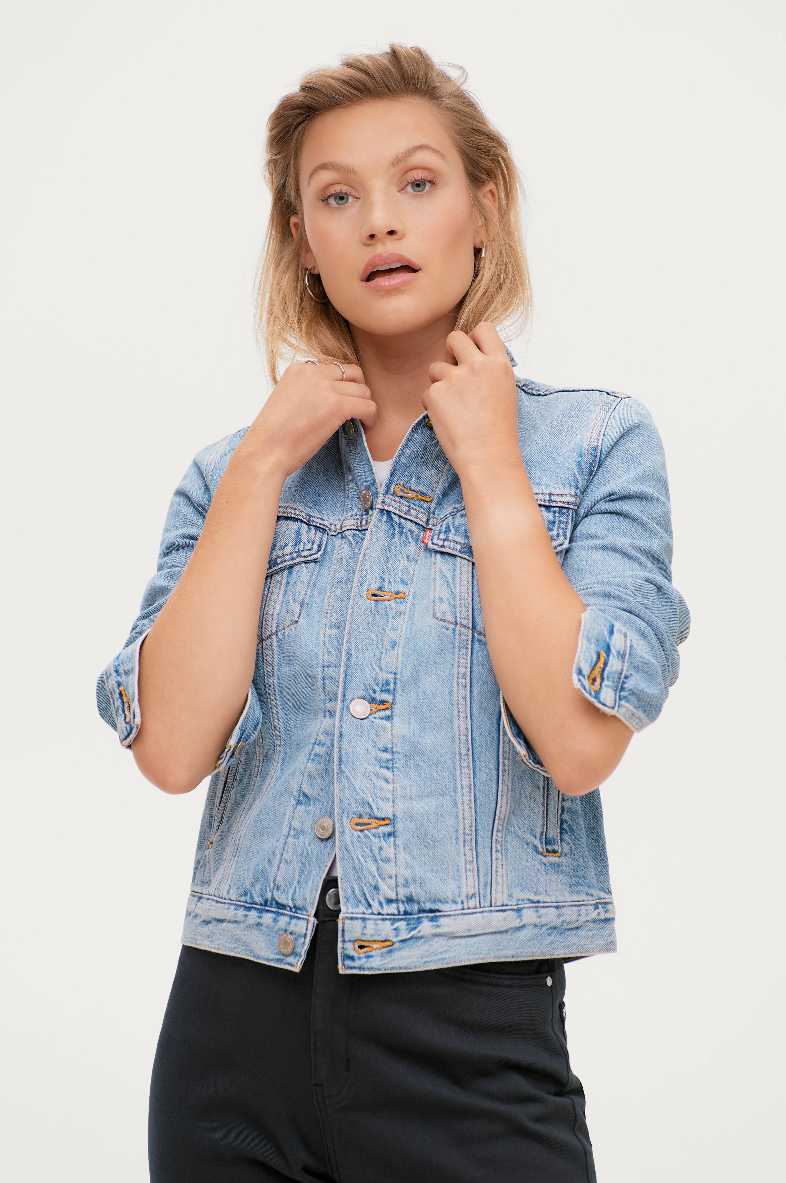 Denimjakke Original Trucker fra Levi s i denim/stretchdenim. Klassisk model med stiksømme samt lukning med metalknapper. To brystlommer med klap og to indsatte lommer forneden samt justerbar tamp bagpå på linningen. Længde ca. 52 cm i str. M.