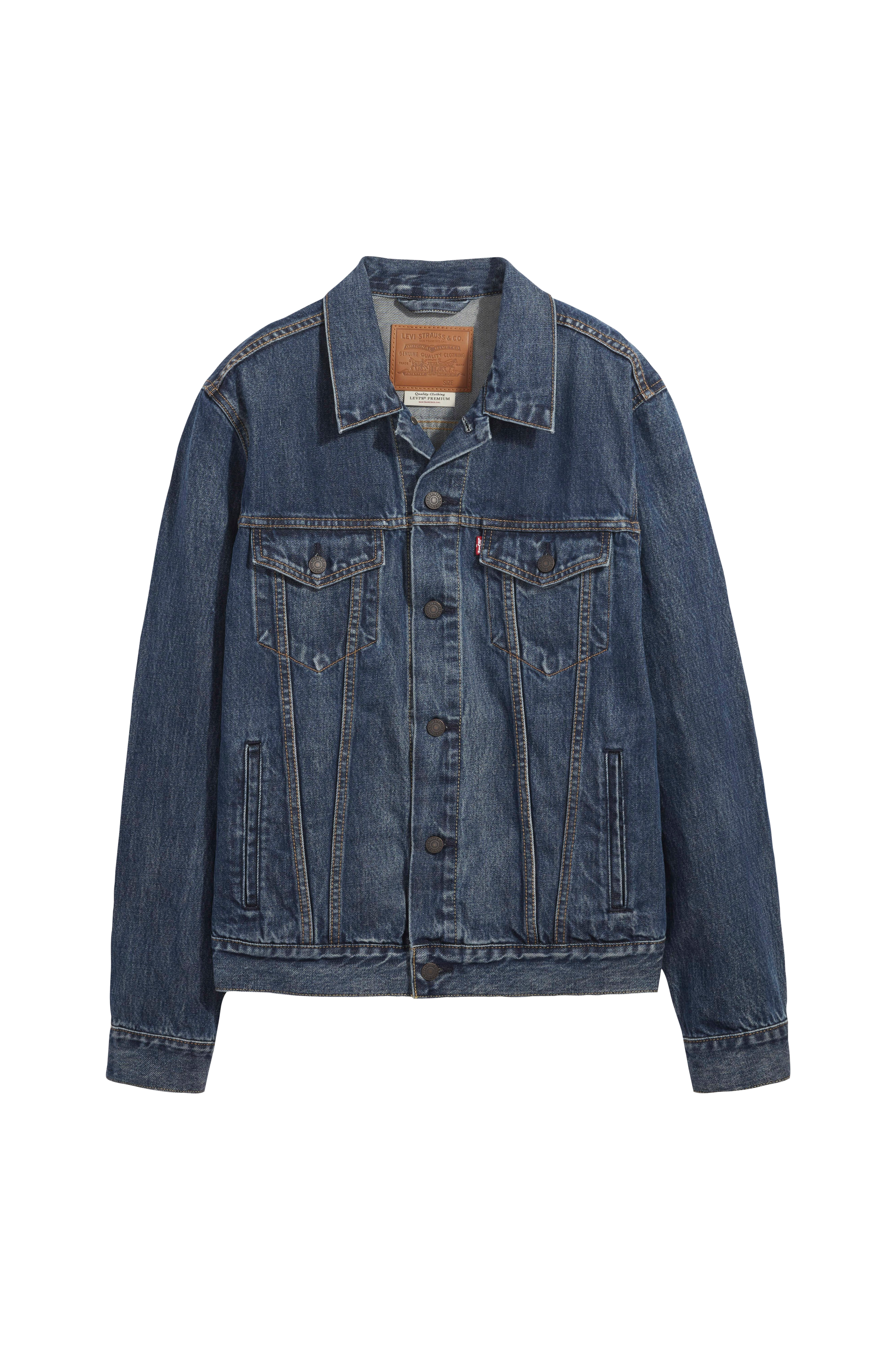 Denimjakke The Trucker Jacket fra Levi's, en klassiker i denim med stretch. Fire forlommer og justerbar tamp i kanten forneden bagpå. Længde ca. 65 cm i str. M.