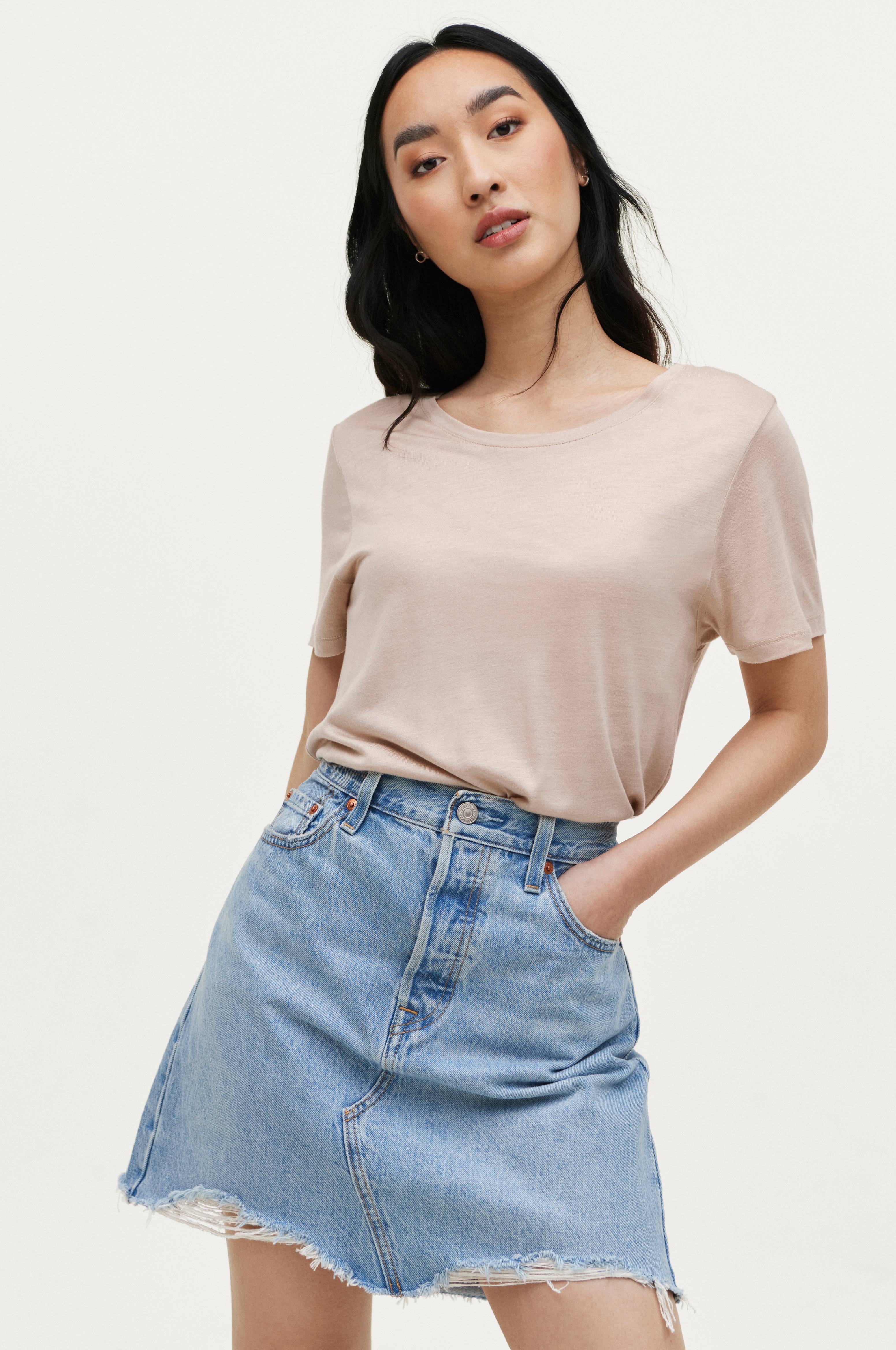 Jeg troede, jeg skulle købe denne lette denim nederdel med revne pletter foran på lårene, men jeg fik en mørk denim spredt nederdel, der bare hænger et „reve…