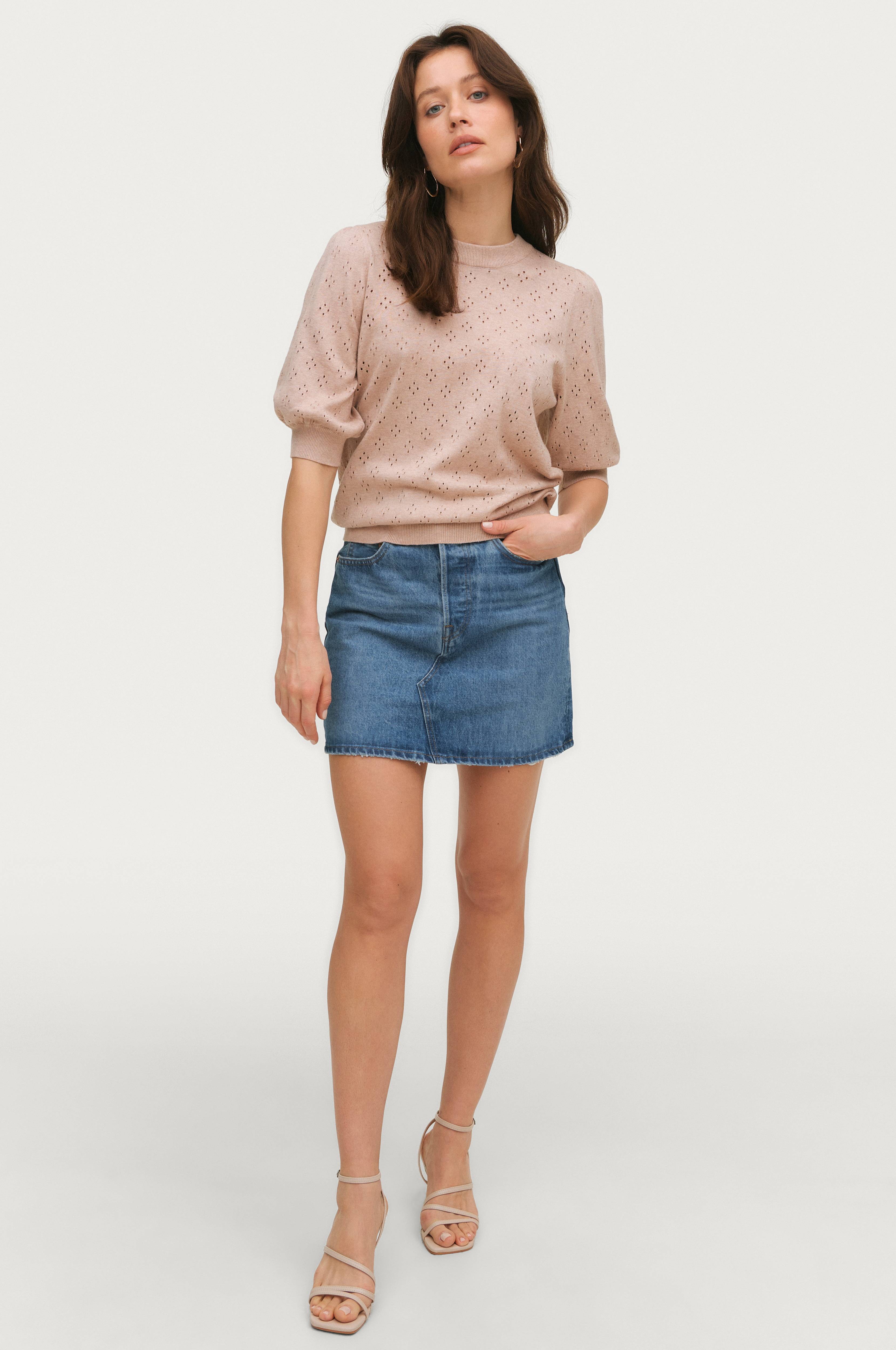Jeg troede, jeg skulle købe denne lette denim nederdel med revne pletter foran på lårene, men jeg fik en mørk denim spredt nederdel, der bare hænger et „reve…
