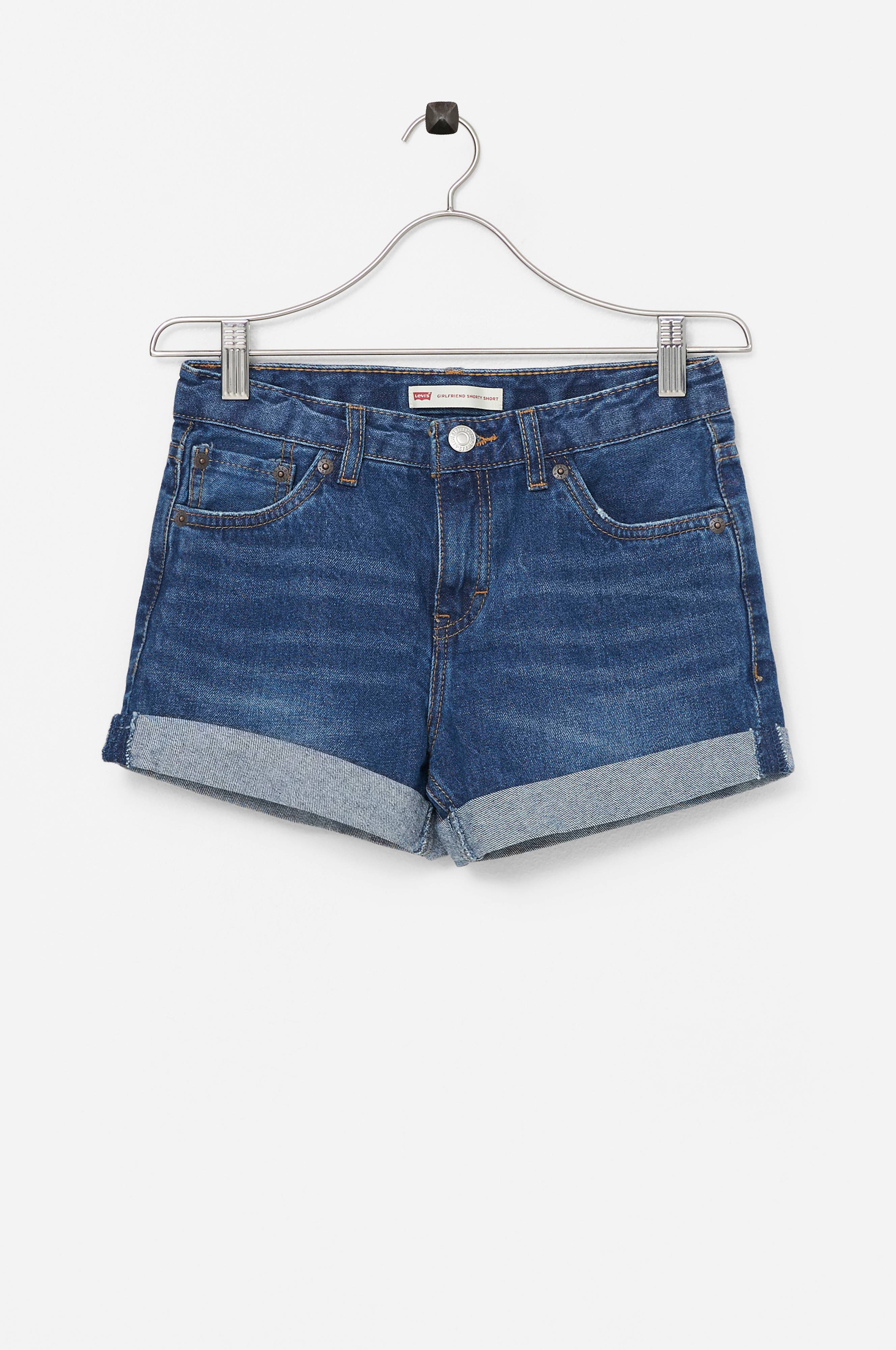 Korte denimshorts med opslag i benkant, fem lommer og lynlåsgylp. Regulerbar talje med knaphulselastik på indersiden.