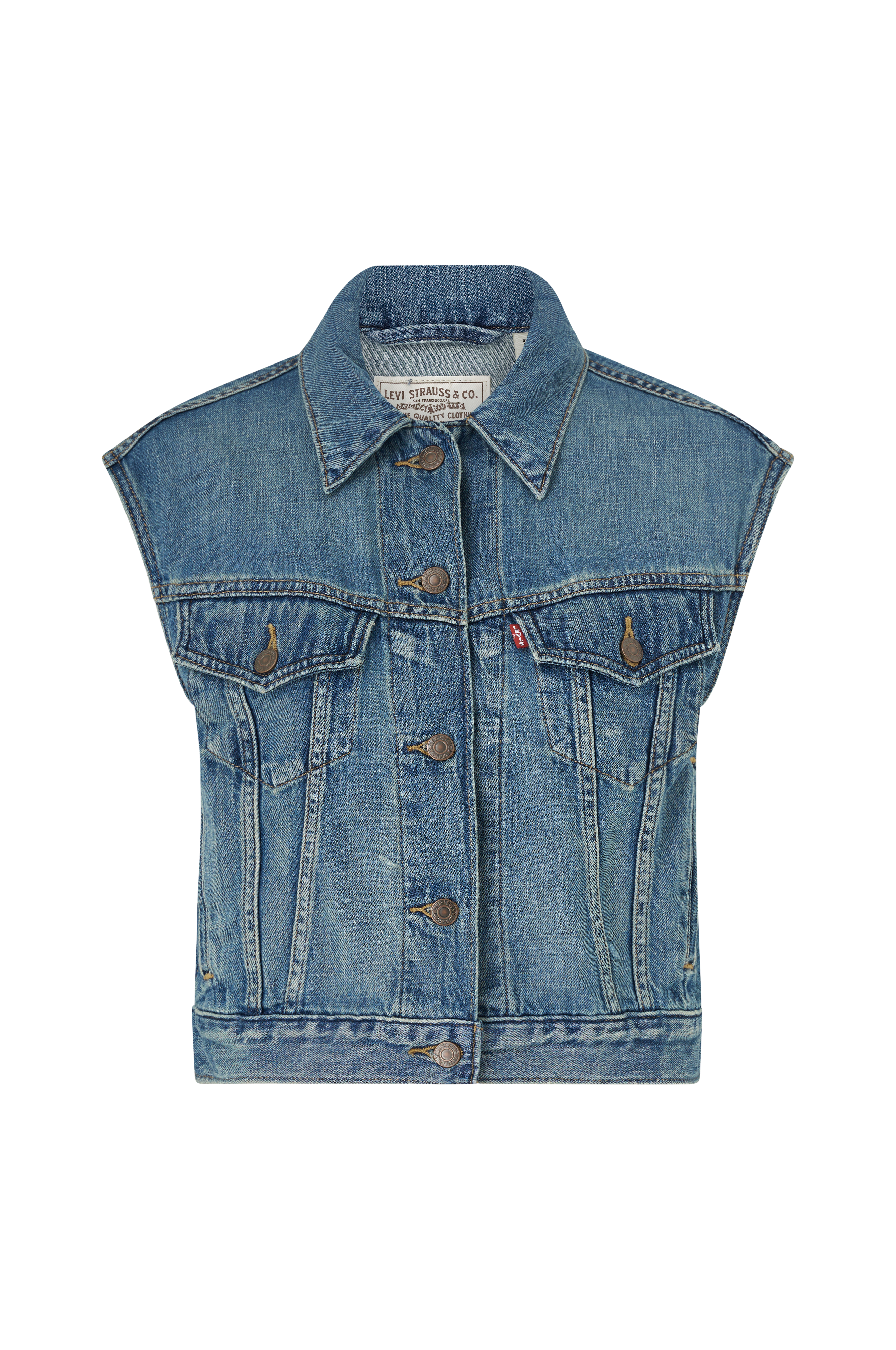 • Denimvest i bomuldsdenim med firkantet design• To brystlommer med låg, knap og lille logomærke• Rund halsudskæring med krave• Knapstolpe foran med knapper i metal• Lommer nede i siderne