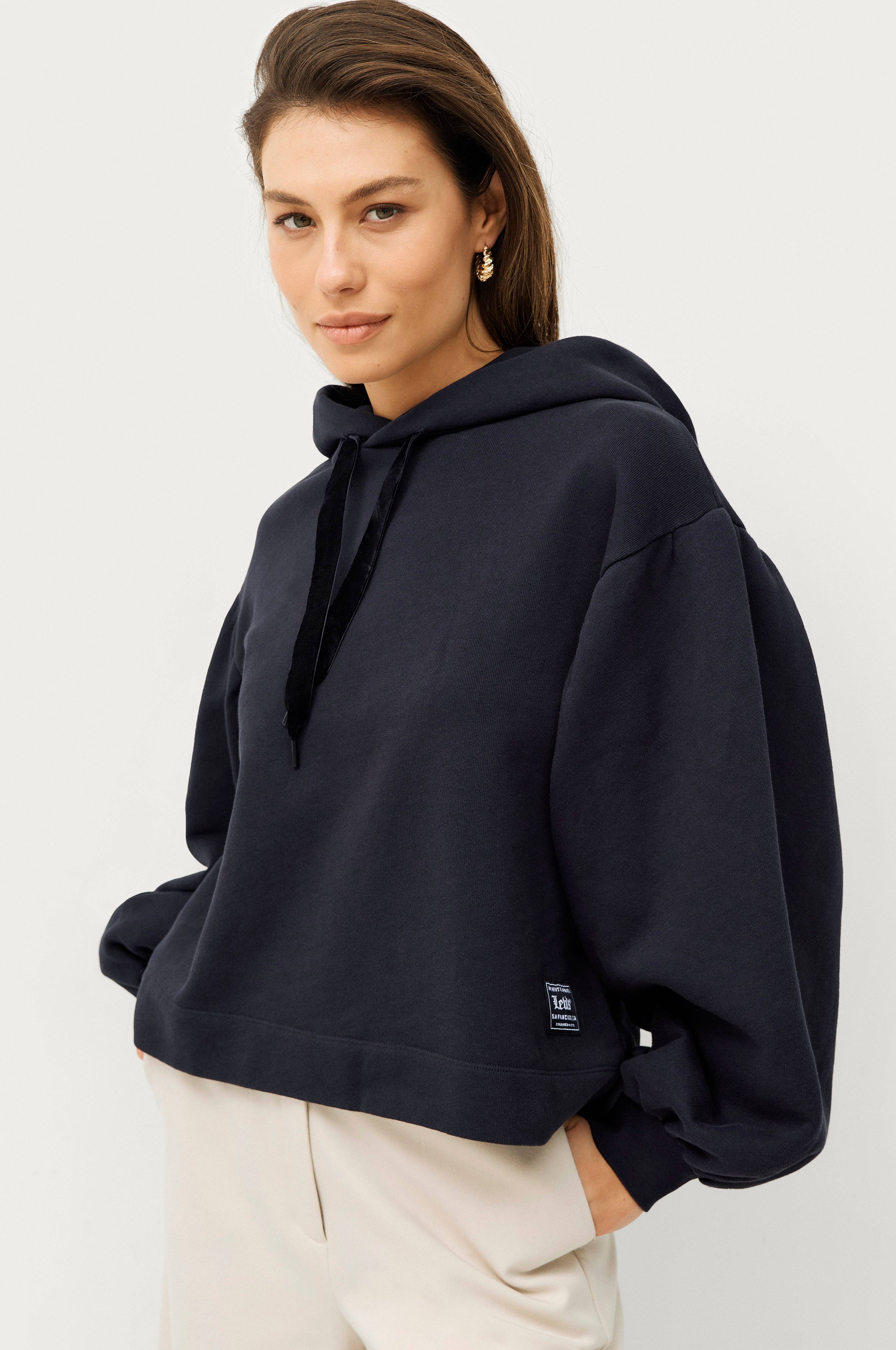 • Voluminøse ballonærmer• Nedsænkede skuldre med samling• Ribmanchet ved manchetterne• Træksnørre i fløjl