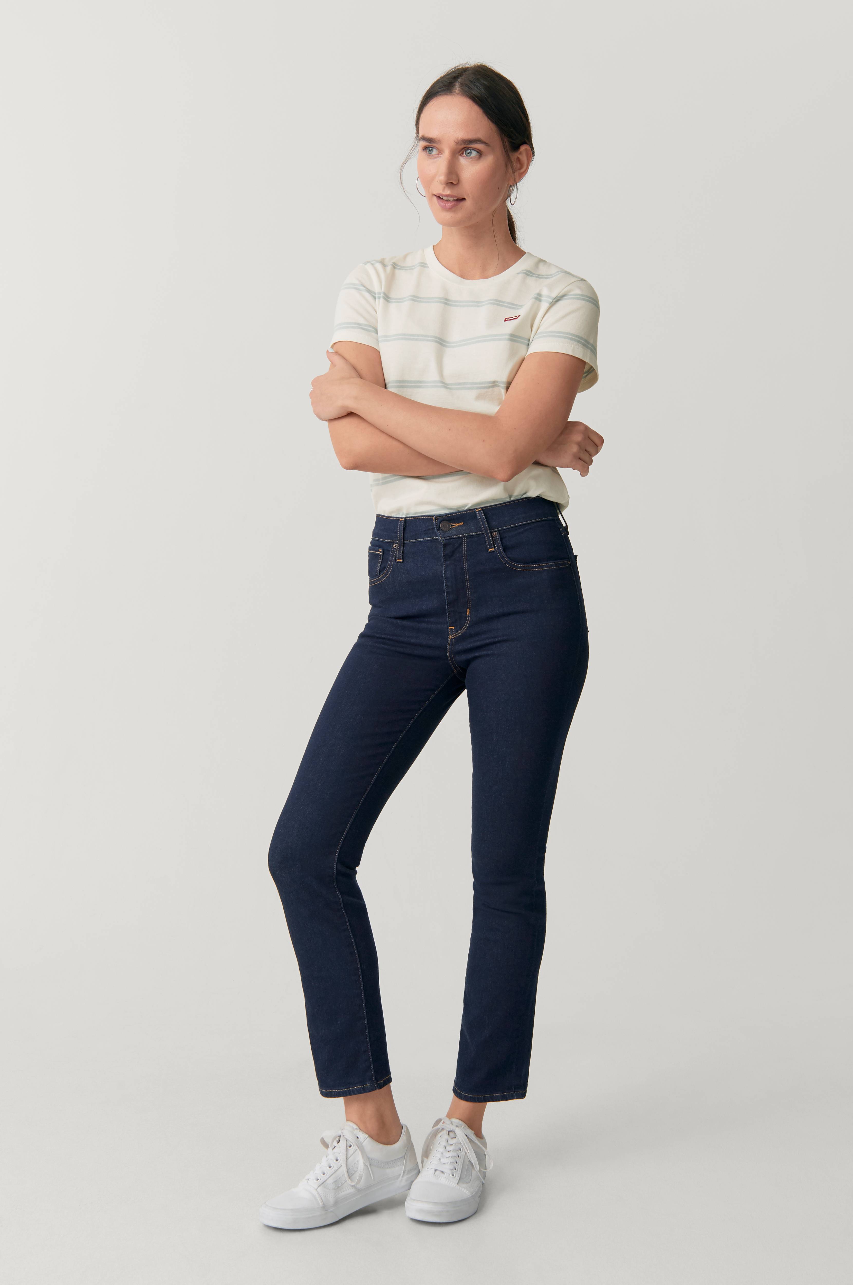 Jeans 724 High Rise Straight fra Levi's. Flot, smal model med høj talje og smalle men lige ben. Linning med stropper og lynlås i gylpen samt tre lommer foran og to lommer bagpå.
